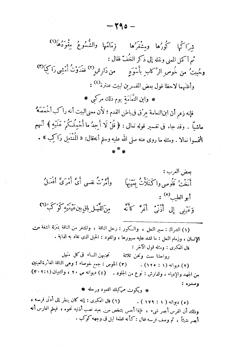 فإنه زعم أن ابن النعامة عِرْق في باطن القدم؛ لأن معنى البيت أنه راكب أخمصَه ماشياً. وقد جاء في تفسير قوله تعالى: (قل لا أجدُ ما أحملُكُم عليه) أنهم التمسوا نعالاً. ومثله ما روي عنه صلى الله عليه وسلم أنه قال: المُنتعِل راكِب.