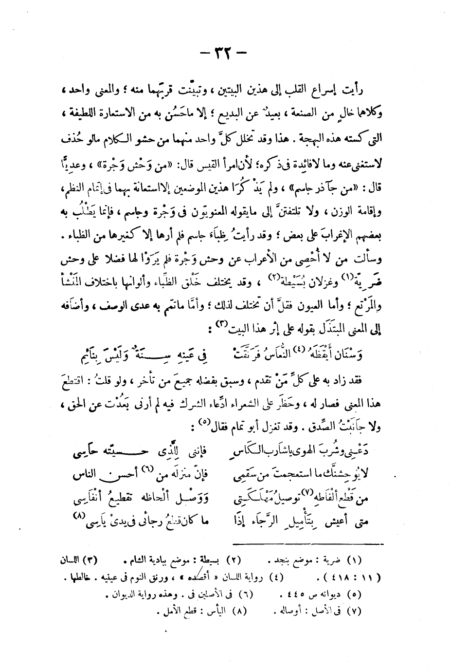 رأيت إسراع القلب الى هذين البيتين، وتبيّنت قربهما منه؛ والمعنى واحد، وكلاهما خالٍ من الصنعة، بعيدٌ عن البديع؛ إلا ما حسُن به من الاستعارة اللطيفة، التي كسته هذه البهجة. هذا وقد تخلل كلّ واحد منهما من حشو الكلام ما لو حُذف لاستغني عنه وما لا فائدة في ذكره؛ لأن امرأ القيس قال: من وَحْش وَجرة، وعديّاً قال: من جآذر جاسم، ولم يذكُرا هذين الموضعين إلا استعانة بهما في إتمام النظم، وإقامة الوزن، ولا تلتفتنّ الى ما يقوله المعنويون في وجْرة وجاسم، فإنما يطْلُب به بعضهم الإغرابَ على بعض؛ وقد رأيتُ ظِباءَ جاسم فلم أرها إلا كغيرها من الظباء. وسألت من لا أُحصي من الأعراب عن وحش وجْرة فلم يرَوا لها فضلاً على وحش ضريّة وغزلان بُسَيطة، وقد يختلف خلْق الظِباء وألوانها باختلاف المنشأ والمرتع؛ وأما العيون فقلّ أن تختلف لذلك؛ وأما ما تمم به عدي الوصف، وأضافه الى المعنى المبتذَل بقوله على إثر هذا البيت: