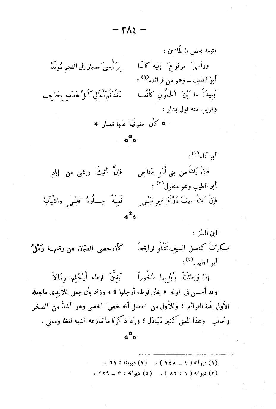 وقد أحسن في قوله يفئن لوطء أرجلها، وزاد بأن جعل للأيدي ما جعله الأول لجملة القوائم؛ وللأول من الفضل أنه خصّ الحصى وهو أشدّ من الصخر وأصلب، وهذا المعنى كثير مُبتذل؛ وإنما ذكرنا ما تنازعه الشبه لفظاً ومعنى.