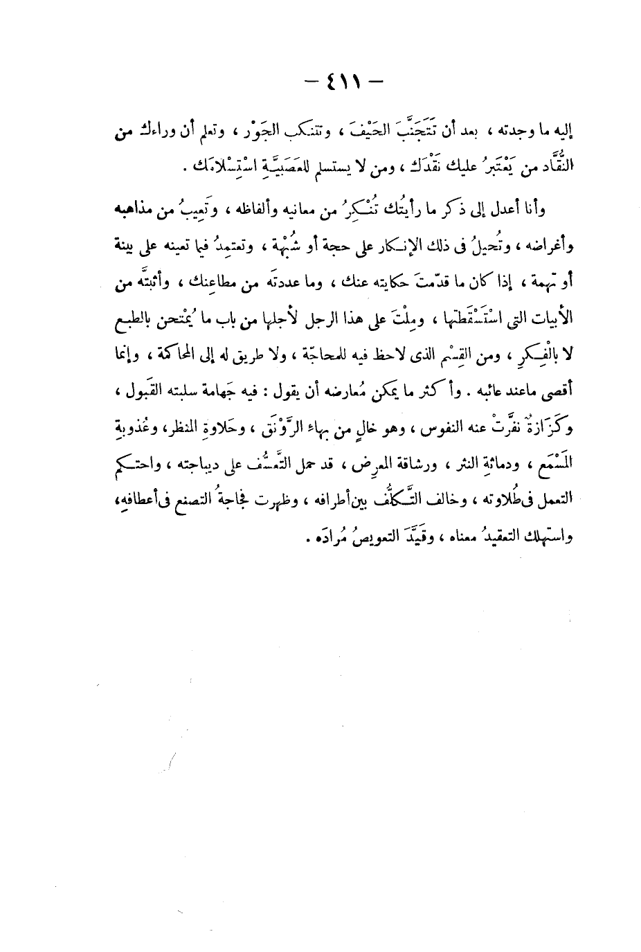 وأنا أعدل الى ذكر ما رأيتُك تُنكرُ من معانيه وألفاظه، وتَعيبُ من مذاهبه وأغراضه، وتُحيلُ في ذلك الإنكار على حجة أو شُبهة، وتعتمِدُ فيما تعينه على بيّنة أو تهمة، إذا كان ما قدّمتَ حكايته عنك، وما عددتَه من مطاعنك، وأثبتّه من الأبيات التي استَسقَطتها، ومِلتَ على هذا الرجل لأجلها من باب ما يُمتحن بالطبع لا بالفِكر، ومن القِسم الذي لاحظ فيه للمحاجّة، ولا طريق له الى المحاكمة، وإنما أقصى ما عند عائبه. وأكثر ما يمكن مُعارضه أن يقول: فيه جهامة سلبته القَبول، وكزازةٌ نفّرتْ عنه النفوس، وهو خالٍ من بهاءِ الرّونق، وحلاوةِ المنظر، وعُذوبة المسْمَع، ودماثةِ النثر، ورشاقة المعرِض، قد حمل التّعسّف على ديباجته، واحتكم التعمل في طلاوته، وخالف التّكلّف بين أطرافه، وظهرت فجاجةُ التصنع في أعطافه، واستهلك التعقيدُ معناه، وقيّد التعويص مُرادَه.