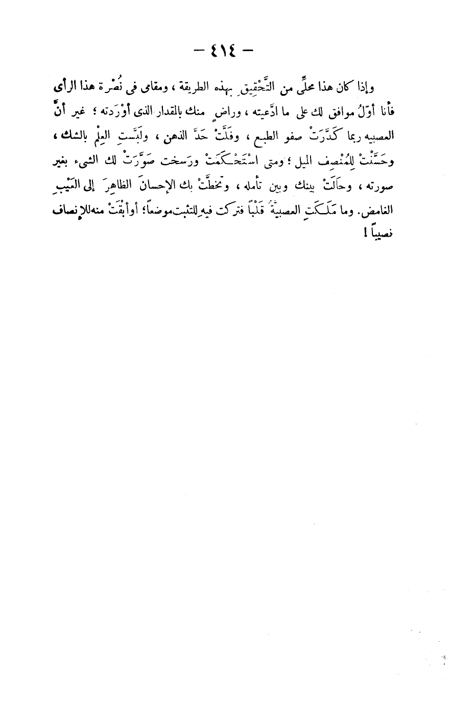 وإذا كان هذا محلي من التحقيق بهذه الطريقة، ومقامي في نصرة هذا الرأي فأنا أول موافق لك على ما ادّعيته، وراضٍ منك بالمقدار الذي أوردته؛ غير أن العصبية ربما كدّرتْ صفو الطبع، وفلّت حدّ الذهن، ولبّستِ العلم بالشك، وحسّنت للمُنصف الميل؛ ومتى استحكمتْ ورسخت صوّرت لك الشيء بغير صورته، وحالتْ بينك وبين تأمله، وتخطّت بك الإحسان الظاهرَ الى العيب الغامض. وما ملكَتِ العصبية قلباً فتركت فيه للتثبت موضعاً؛ أو أبقَتْ منه للإنصاف نصيباً!