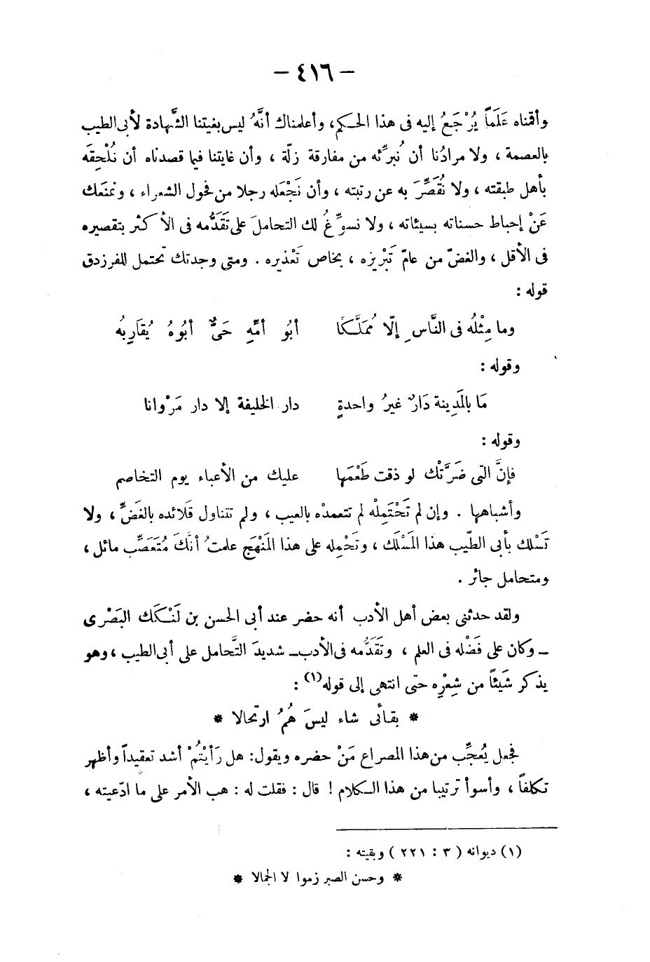 وأقمناه علَماً يرجَع إليه في هذا الحكم، وأعلمناك أنه ليس بغيتنا الشهادة لأبي الطيب بالعصمة، ولا مرادُنا أن نبرّئه من مقارفة زلّة، وأن غايتنا فيما قصدنا أن نلحِقَه بأهل طبقته، ولا نقصّر به عن رتبته، وأن نجعله رجلاً من فحول الشعراء، ونمنعك عن إحباط حسناته بسيئاته، ولا نسوّغ لك التحامل على تقدّمه في الأكثر بتقصيره في الأقل، والغضّ من عامّ تبريزه، بخاص تعذيره. ومتى وجدتك تحتمل للفرزق قوله: