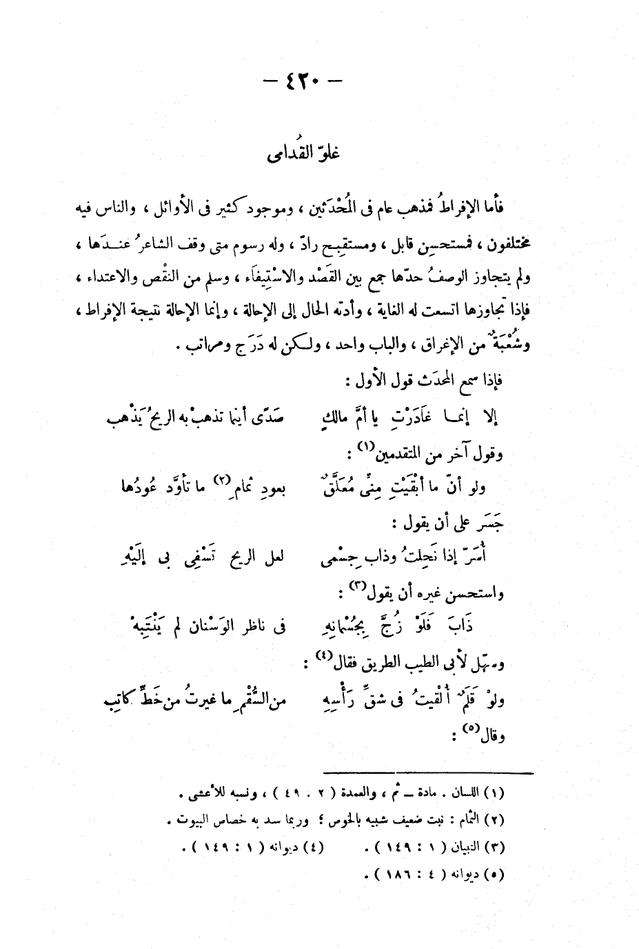 فأما الإفراط فمذهب عام في المُحدَثين، وموجود كثير في الأوائل، والناس فيه مختلفون، فمستحسِن قابل، ومستقبِح رادّ، وله رسوم متى وقف الشاعر عندَها، ولم يتجاوز الوزصف حدّها جمع بين القصْد والاستيفاء، وسلم من النقْص والاعتداء، فإذا تجاوزها اتسمت له الغاية، وأدته الحال الى الإحالة، وإنما الإحالة نتيجة الإفراط، وشُعبة من الإغراق، والباب واحد، ولكن له درَج ومراتب.