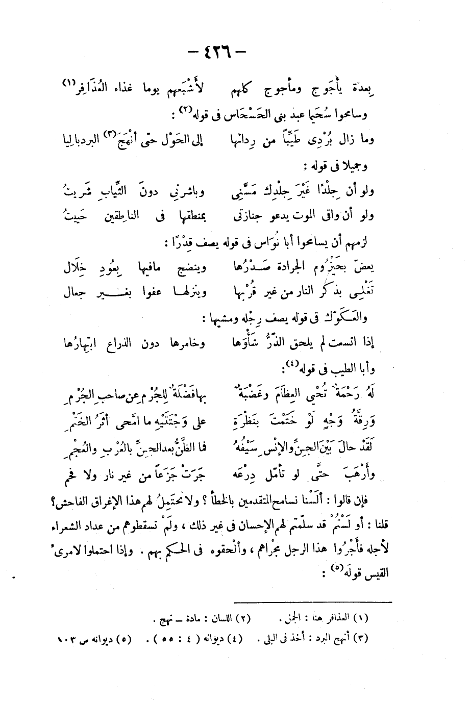 فإن قالوا: ألسنا نسامح المتقدمين بالخطأ؟ ولا نحتمِل لهم هذا الإغراق الفاحش؟ قلنا: أو لستُم قد سلّمتم لهم الإحسان في غير ذلك، ولم تسقطوهم من عداد الشعراء لأجله فأجروا هذا الرجل مجراهم، وألحقوه في الحكم بهم. وإذا احتملوا لامرئ القيس قوله: