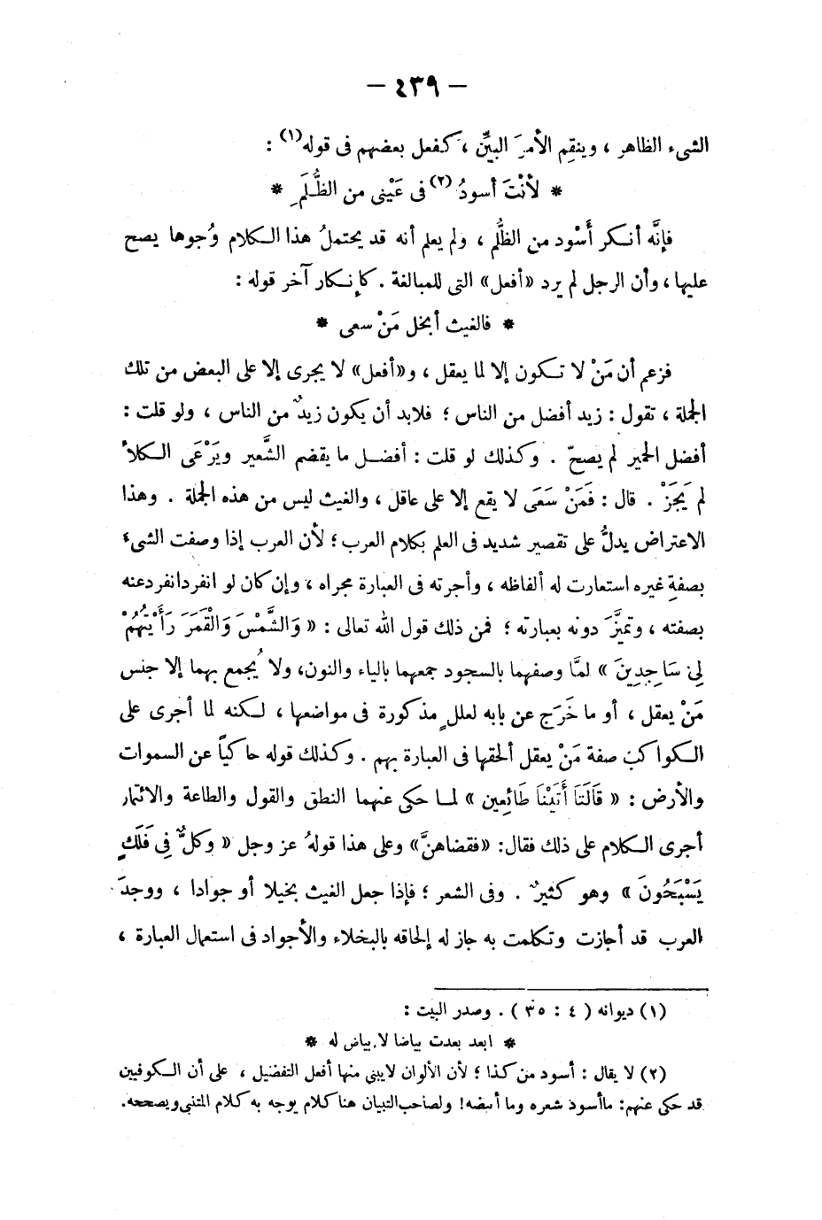 فزعم أن من لا تكون إلا لما يعقل، وأفعل لا يجري إلا على البعض من تلك الجملة، تقول: زيد أفضل من الناس؛ فلا بد أن يكون زيدٌ من الناس، ولو قلت: أفضل الحمير لم يصحّ. وكذلك لو قلت: أفضل ما يقضم الشّعير ويرْعى الكلأ لم يجُزْ. قال فمَنْ سَعى لا يقع إلا على عاقل، والغيث ليس من هذه الجملة، وهذا الاعتراض يدلّ على تقصير شديد في العلم بكلام العرب؛ لأن العرب إذا وصفت الشيءَ بصفة غيره استعارت له ألفاظه، وأجرته في العبارة مجراه، وإن كان لو انفرد انفرد عنه بصفته، وتميّز دونه بعبارته؛ فمن ذلك قول الله تعالى: (والشمسَ والقمرَ رأيتُهم لي ساجِدين) لمّا وصفهما بالسجود جمعهما بالياء والنون، ولا يُجمع بهما إلا جنس مَن يعقل، أما خرَج على بابه لعللٍ مذكورة في مواضعها، لكنه لما أجرى على الكواكب صفة من يعقل ألحقها في العبارة بهم. وكذلك قوله حاكياً عن السموات والأرض: (قالَتا أتيْنا طائِعين) لما حكى عنهما النطق والقول والطاعة والائتمار أجرى الكلام على ذلك فقال: فقضاهنّ، وعلى هذا قوله عز وجل (وكلٌ في فلَكٍ يسبحون) وهو كثير. وفي الشعر؛ فإذا جعل الغيث بخيلاً أو جواداً، ووجد العرب قد أجازت وتكلمت به جاز له إلحاقه بالبخلاء والأجواد في استعمال العبارة،