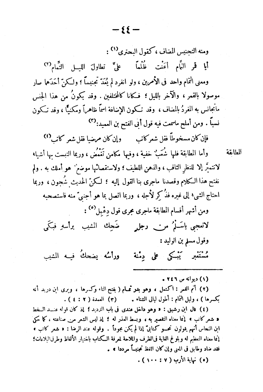 ومعنى التمام واحد في الأمرين، ولو انفرد لم يعدّ تجنيساً؛ ولكن أحدَهما صار موصولاً بالقمر، والآخر بالليل؛ فكانا كالمختلفين. وقد يكون من هذا الجنس ما تجانس به المفردُ بالمضاف، وقد تكون الإضافة اسماً ظاهراً ومكنيّاً، وقد تكون نسباً. ومن أملح ما سمعت فيه قول أبي الفتح بن العميد: