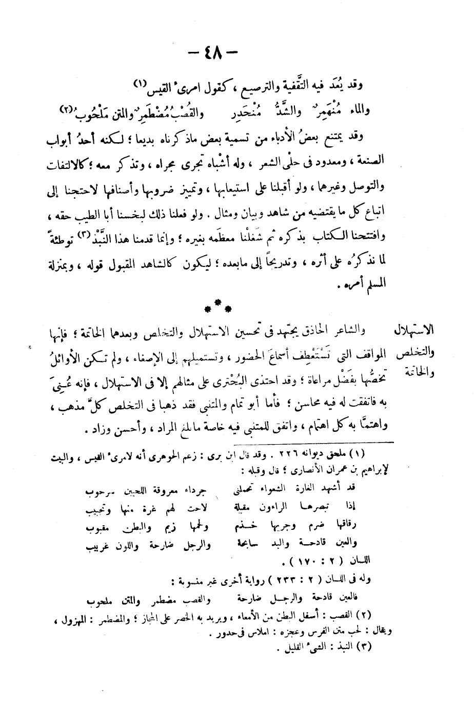 والشاعر الحاذق يجتهد في تحسين الاستهلال والتخلص وبعدهما الخاتمة؛ فإنها المواقف التي تستعْطِف أسماعَ الحضور، وتستميلهم الى الأصغاء، ولم تكن الأوائل تخصّها بفضْل مراعاة؛ وقد احتذى البُحتري على مثالهم إلا في الاستهلال، فإنه عُني به فاتفقت له فيه محاسن؛ فأما أبو تمام والمتنبي فقد ذهبا في التخلص كلَّ مذهب، واهتمّا به كل اهتمام، واتفق للمتنبي فيه خاصة ما بلغ المراد، وأحسن وزاد.