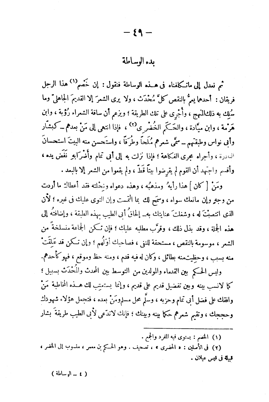 وليس الحكم بين القدماء والمولدين من التوسط بين المحدث والمُحدَث بسبيل؛ كما لا نسب بينه وبين تفضيل قديم على قديم، وإنما يستعتِب لك هذه المخاطبة مَنْ وافقك على فضل أبي تمام وحزبه، وسلّم محل مسلم ومنْ بعده، فتجعل هؤلاء شهودك وحججك، وتقيم شعرهم حكماً بينه وبينك؛ فإنك لا تدّعي لأبي الطيب طريقةَ بشار