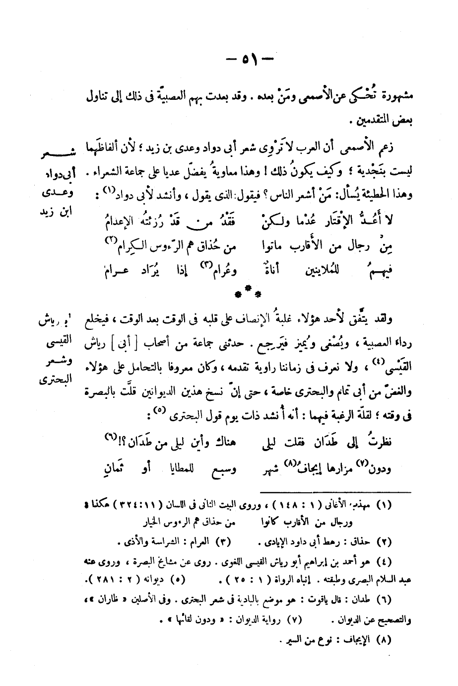 زعم الأصمعي أن العراب لا تَروي شعر أبي دواد وعدي بن زيد؛ لأن ألفاظَهما ليست بنجْدية؛ وكيف يكون ذلك! وهذا معاويةُ يفضّل عدياً على جماعة الشعراء. وهذا الحطيئة يُسأل: مَن أشعر الناس؟ فيقول: الذي يقول، وأنشد لأبي دواد:
