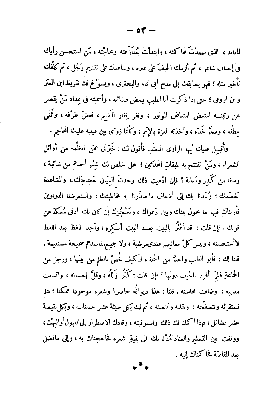 وأُقبِل عليك أيها الراوي المتعتّب فأقول لك: خبّرني عمّن تعظّمه من أوائل الشعراء، ومن تفتتح به طبقاتِ المحدَثين؛ هل خلص لك شعْر أحدهم من شائبة، وصفا من كدِر ومَعابة؟ فإن ادّعيت ذلك وجدت العِيان حجيجَك، والمشاهدة خصْمك؛ وعدنا بك الى أضعاف ما صدّرنا به مخاطبتك، واستعرضنا الدواوين فأريناك فيها ما يحول بينك وبين دعواك، ويحجُزك إن كان بك أدنى مُسكة عن قولك. فإن قلت: قد أعثُر بالبيت بعد البيت أنكِره، وأجد اللفظ بعد اللفظ لا أستحسنه، وليس كلّ معانيهم عندي مرضية، ولا جميع مقاصدهم صحيحة مستقيمة. قلنا لك: فأبو الطيب واحدٌ من الجملة، فكيف خُصّ بالظلم من بينها، ورجل من الجماعة فلِم أفرد بالحيف دونها؟ فإن قلت: كثُر زللُه، وقلّ إحسانه، واتسعت معايبه، وضاقت محاسنه. قلنا: هذا ديوانُه حاضراً وشعره موجوداً ممكناً؛ هلم نستقرئه ونتصفّحه، ونقلبه ونمتحنه، ثم لك بكل سيئة عشر حسنات، وبكل نقيصة عشر فضائل، فإذا أكملنا لك ذلك واستوفيته، وقادك الاضطرار الى القبول والبهْت، ووقفت بين التسليم والعناد عُدْنا بك الى بقية شعره فحاججناك به، والى ما فضل بعد المقاصّة فحاكمناك إليه.