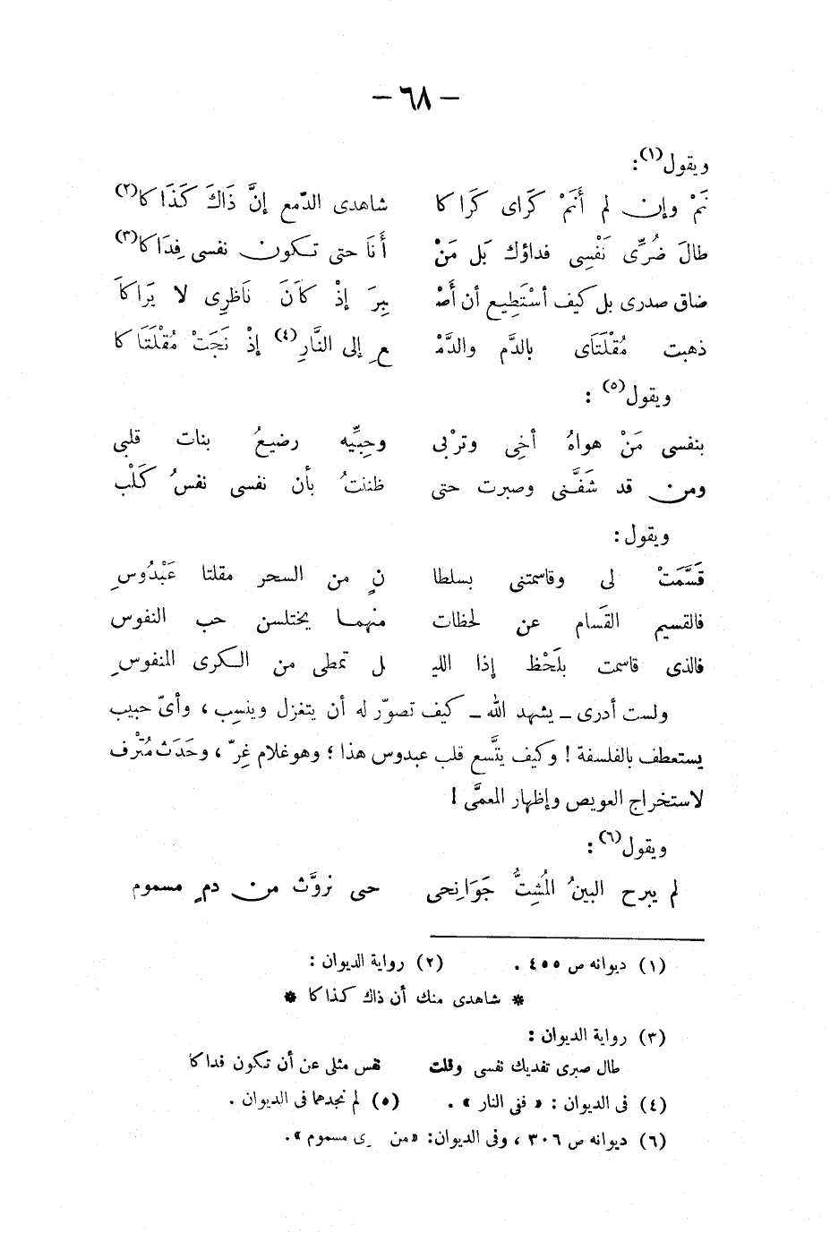 ولست أدري - يشهد الله - كيف تصوّر له أن يتغزّل وينسِب، وأي حبيب يستعطف بالفلسفة! وكيف يتّسع قلب عبدوس هذا؛ وهو غلام غِرّ، وحدَث مُتْرف لاستخراج العويص وإظهار المعمّى! ويقول: