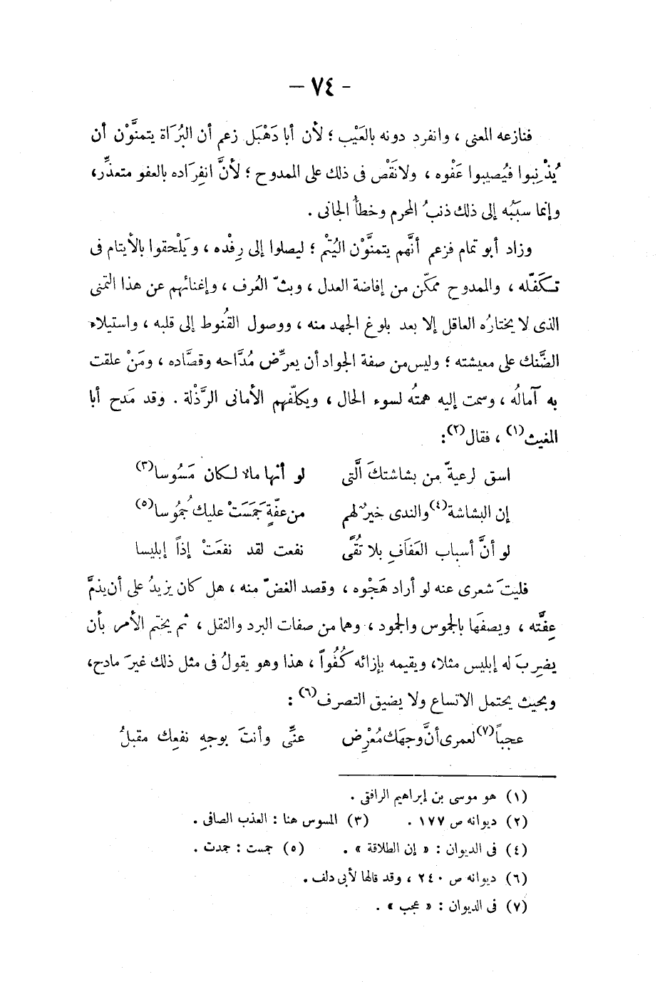 فنازعه المعنى، وانفرد دونه بالعيب؛ لأن أبا دَهبل زعم أن البرآء يتمنون أن يُذنِبوا فيُصيبوا عفوة، ولا نقْص في ذلك على الممدوح؛ لأن انفراده بالعفو متعذّر، وإنما سببه الى ذلك ذنب المحرم وخطأ الجاني.