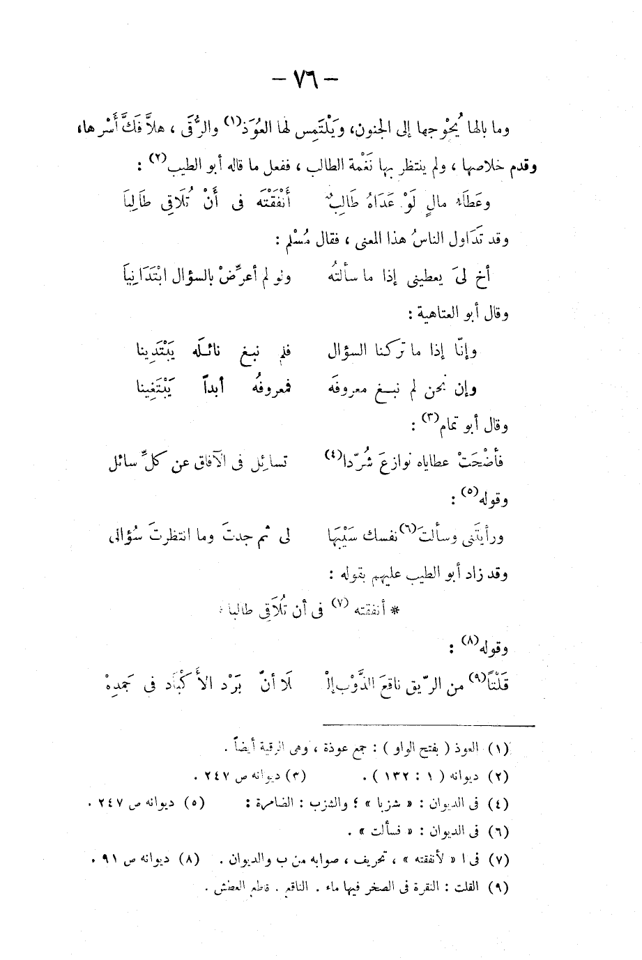 وما بالها يحوجها الى الجنون، ويلتمس لها العُوذ والرُقى، هلاّ فاكّ أسرها، وقدم خلاصها، ولم ينتظر بها نغمة الطالب، ففعل ما قاله أبو الطيب: