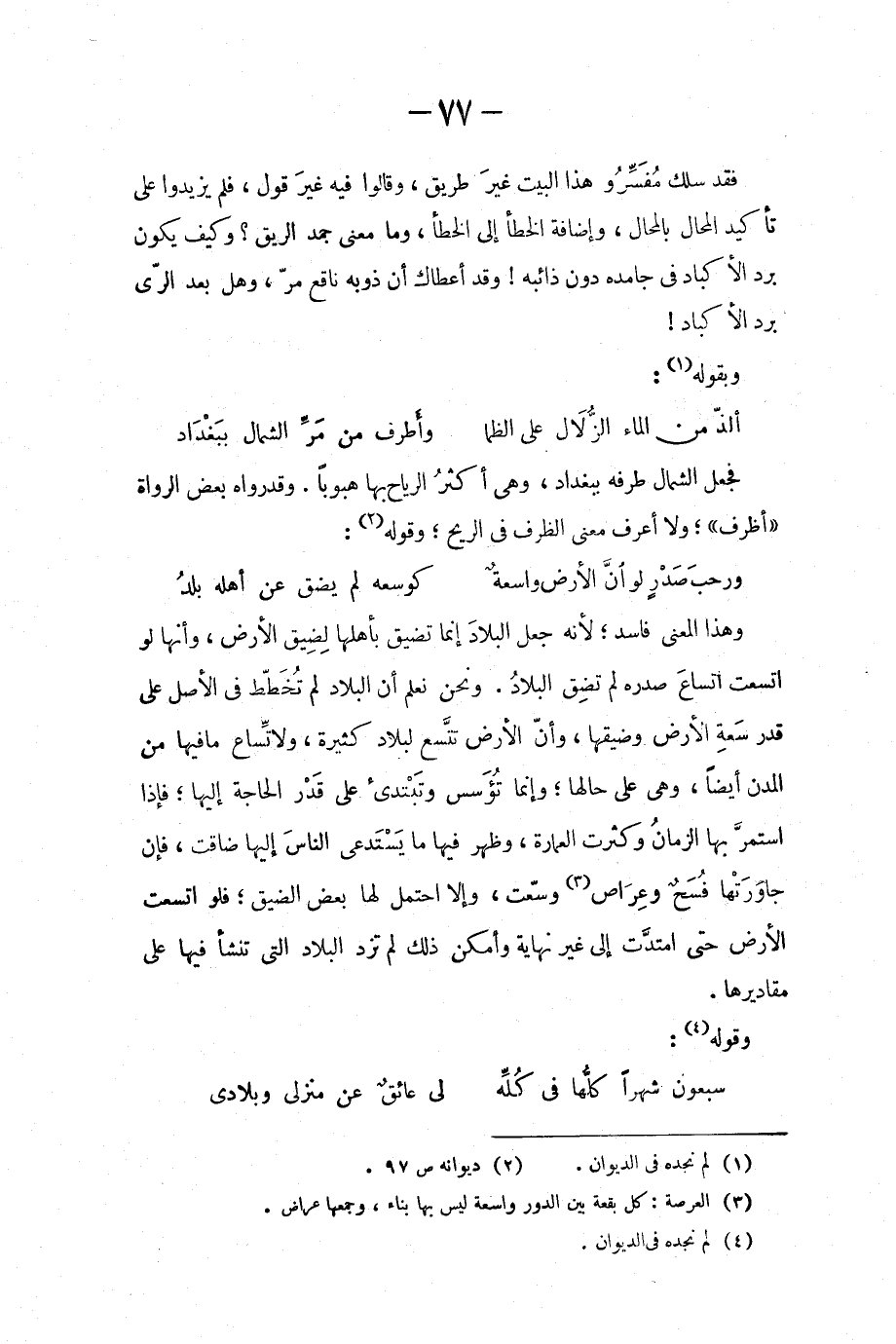 وهذا المعنى فاسد؛ لأنه جعل البلادَ إنما تضيق بأهلها لضيق الأرض، وأنها لو اتسعت اتساعَ صدره لم تضِق البلاد. ونحن نعلم أن البلاد لم تخطط في الأصل على قدر سعةِ الأرض وضيقها، وأن الأرض تتّسع لبلاد كثيرة، ولاتّساع ما فيها من المدن أيضاً، وهي على حالها؛ وإنما تؤَسس وتبتدئ على قدر الحاجة إليها؛ فإذا استمر بها الزمان وكثرت العمارة، وظهر فيها ما يستدعي الناسَ إليها ضاقت، فإن جاورَتْها فُسَح وعِراص وسّعت، وإلا احتمل لها بعض الضيق؛ فلو اتسعت الأرض حتى امتدّت إلى غير نهاية وأمكن ذلك لم تزد البلاد التي تنشأ فيها على مقاديرها.