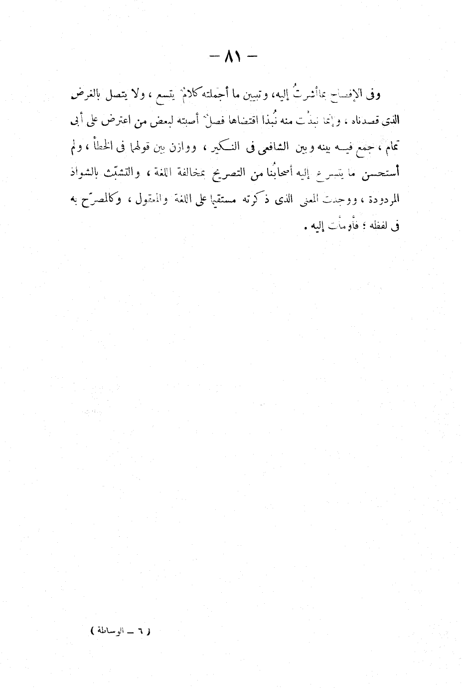 وفي الإفصاح بما أشرت إليه، وتبيين ما أجملته كلامٌ يتسع، ولا يتصل بالغرض الذي قصدناه، وإنما نبذْت منه نُبذاً اقتضاها فصلٌ أصبته لبعض من اعترض على أبي تمام، جمع فيه بينه وبين الشافعي في النكير، ووازن بين قولهما في الخطأ، ولم أستحسن ما يتسرع إليه أصحابنا من التصريح بمخالفة اللغة، والتشبّث بالشواذ المردودة، ووجدت المعنى الذي ذكرته مستقيماً على اللغة والمعقول، وكالمصرّح به في لفظه؛ فأومأت إليه.