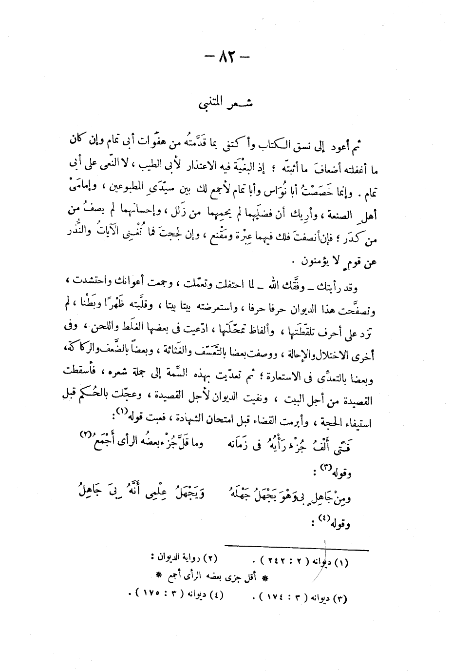 ثم أعود الى نسق الكتاب وأكتفي بما قدّمته من هفوات أبي تمام وإن كان ما أغفلته أضعاف ما أثبتّه؛ إذ البغْية فيه الاعتذار لأبي الطيب، لا النّعي على أبي تمام. وإنما خصَصْتُ أبا نُواس وأبا تمام لأجمع لك بين سيّدي المطبوعين، وإمامَي أهل الصنعة، وأريك أن فضلَهما لم يحمِهما من زلل، وإحسانهما لم يصفُ من كدَر؛ فإن أنصفتَ فلك فيهما عبرة ومَقنع، وإن لججت فما تُغْني الآياتُ والنّذر عن قومٍ لا يؤمنون.