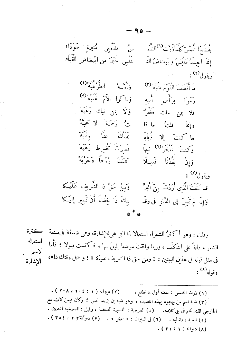 وقلت: وهو أكثر الشعراء استعمالاً لذا التي هي للإشارة، وهي ضعيفة في صنعة الشعر، دالة على التكلّف، وربما وافقت موضعاً يليقُ بها، فاكتست قبولاً؛ فأما في مثل قوله في هذين البيتين: ومن حق ذا الشريف عليكا؛ وفي وقتك ذا، وقوله: