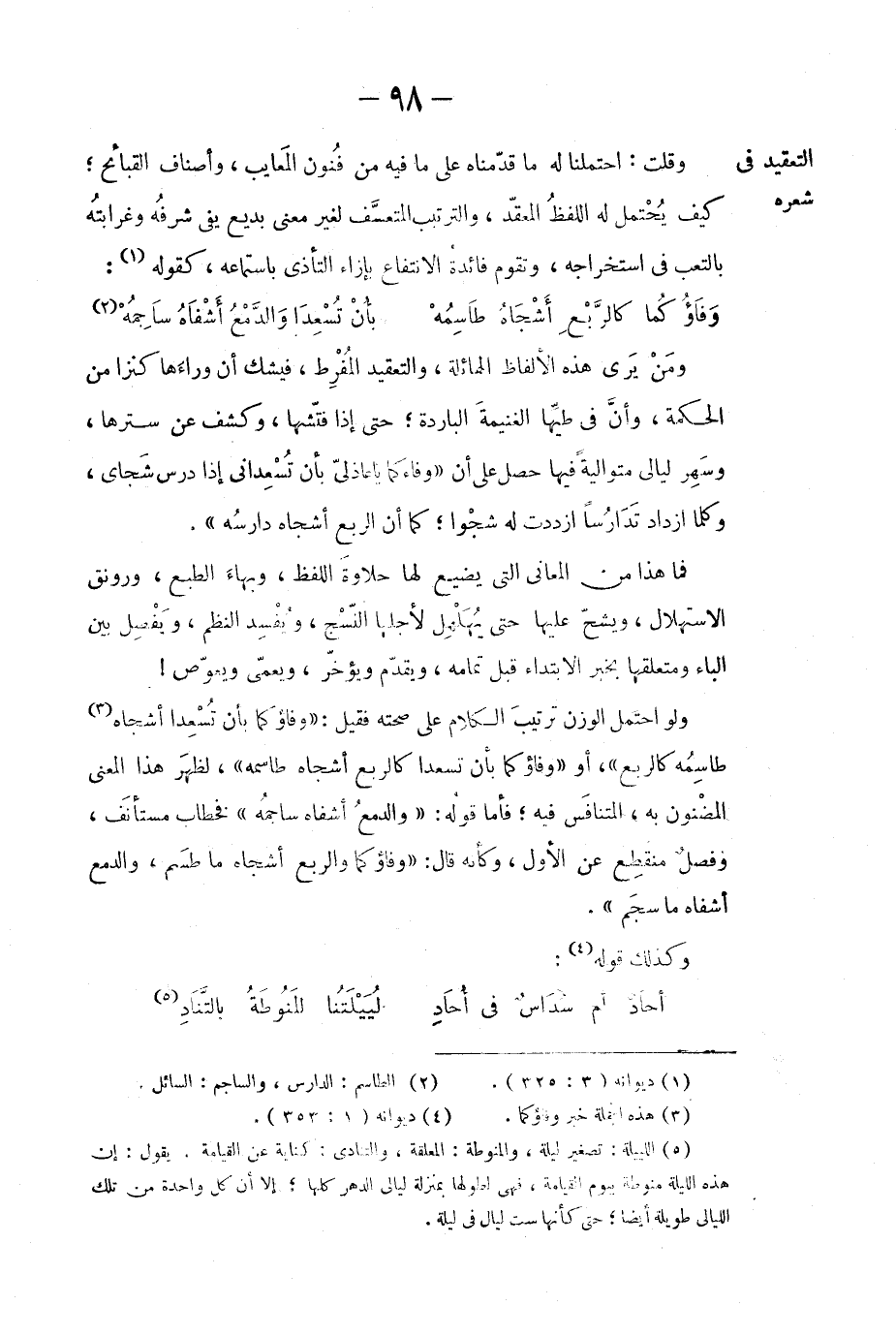 ومن يرى هذه الألفاظ الهائلة، والتعقيد المُفرط، فيشك أن وراءَها كنزاً من الحكمة، وأن في طيّها الغنيمة الباردة؛ حتى إذا فتّشها، وكشف عن سترها، وسهِر ليالي متوالية فيها حصل على أن وفاء كما يا عاذليّ بأن تُسعِداني إذا درس شجاي، وكلما ازداد تدارُساً ازددت له شجْوا؛ كما أن الربع أشجاه دارسُه.
