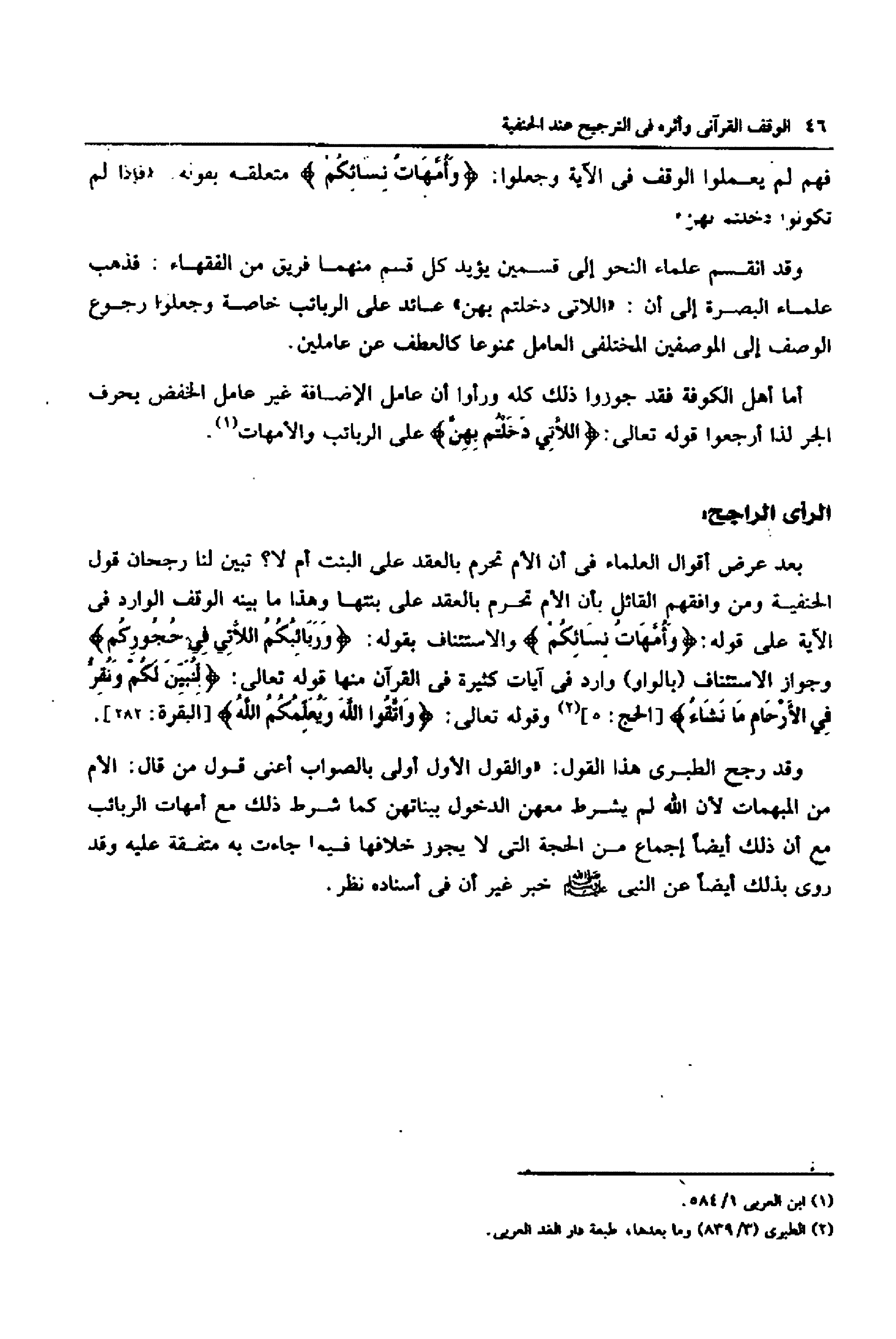 بعد عرض أقوال العلماء فى أن الأم تحرم بالعقد على البنت أم لا؟ تبين لنا رجحان قول الحنفية ومن وافقهم القائل بأن الأم تحرم بالعقد على بنتها وهذا ما بينه الوقف الوارد فى الآية على قوله: وَأُمَّهاتُ نِسائِكُمْ والاستئناف بقوله: وَرَبائِبُكُمُ اللَّاتِي فِي حُجُورِكُمْ وجواز الاستئناف (بالواو) وارد فى آيات كثيرة فى القرآن منها قوله تعالى: لِنُبَيِّنَ لَكُمْ وَنُقِرُّ فِي الْأَرْحامِ ما نَشاءُ [الحج: 5] «2» وقوله تعالى: وَاتَّقُوا اللَّهَ وَيُعَلِّمُكُمُ اللَّهُ [البقرة: 282].