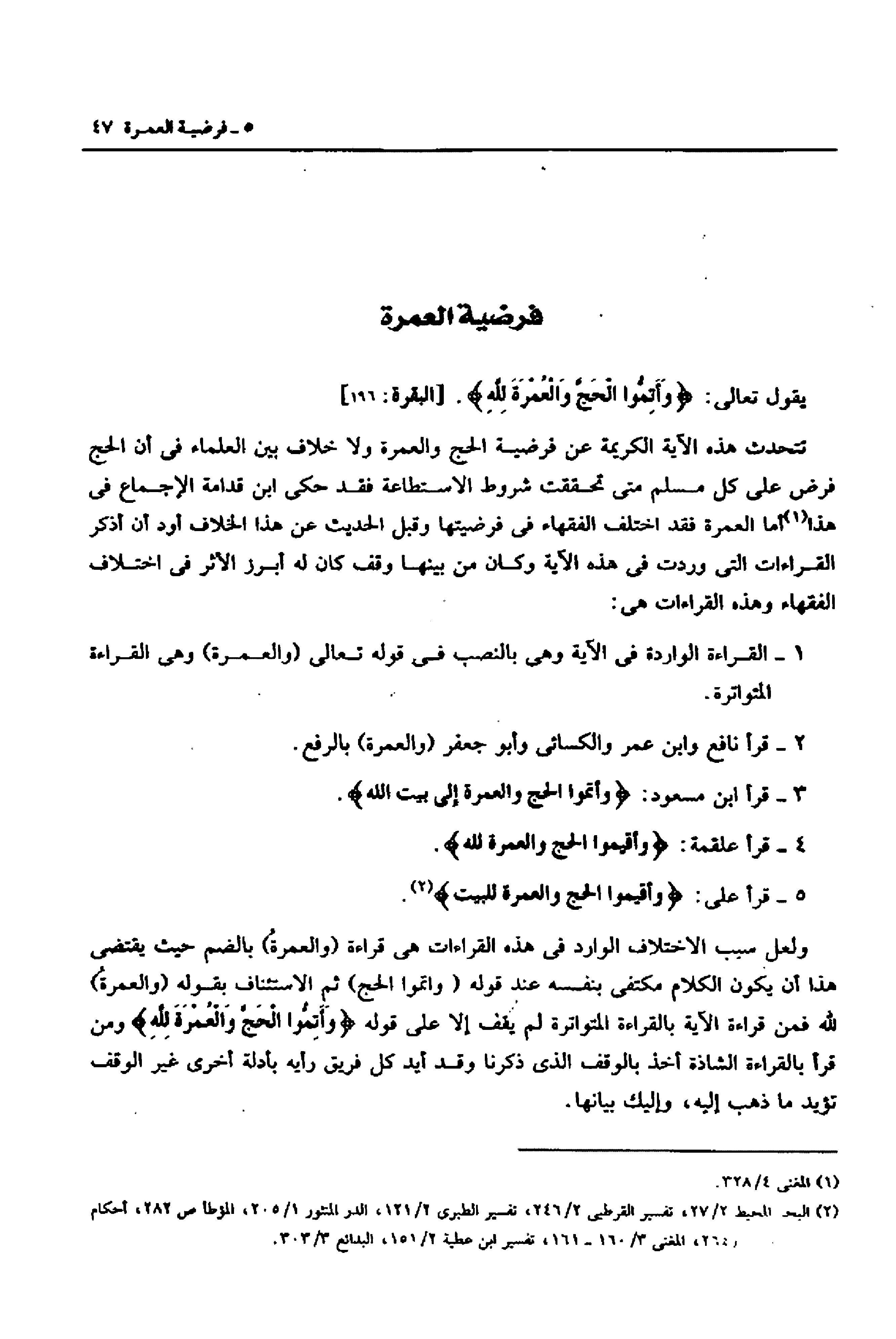 تتحدث هذه الآية الكريمة عن فرضية الحج والعمرة ولا خلاف بين العلماء فى أن الحج فرض على كل مسلم متى تحققت شروط الاستطاعة فقد حكى ابن قدامة الإجماع فى هذا «1» أما العمرة فقد اختلف الفقهاء فى فرضيتها وقبل الحديث عن هذا الخلاف أود أن أذكر القراءات التى وردت فى هذه الآية وكان من بينها وقف كان له أبرز الأثر فى اختلاف الفقهاء وهذه القراءات هى: