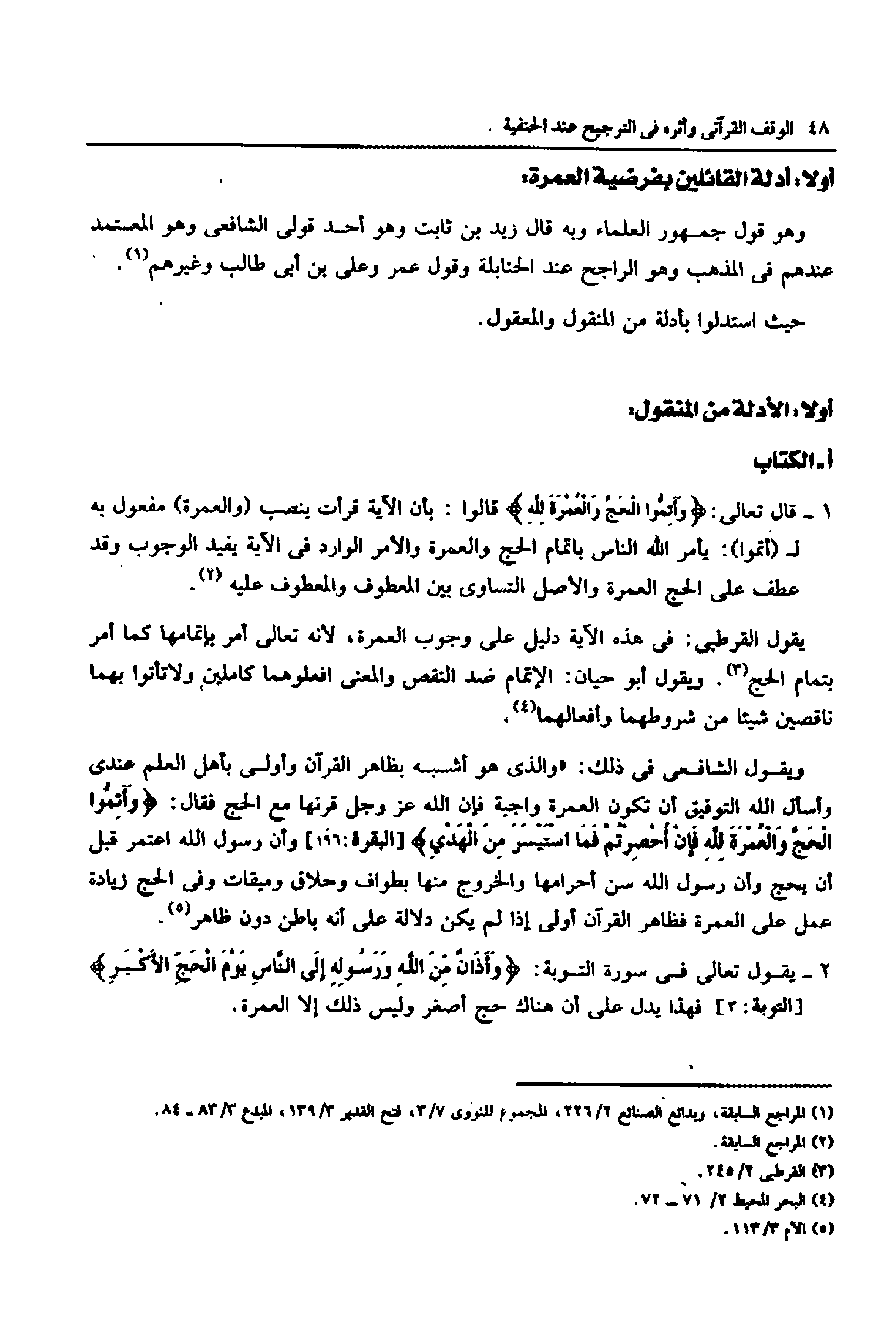 ويقول الشافعى فى ذلك: «والذى هو أشبه بظاهر القرآن وأولى بأهل العلم عندى وأسأل الله التوفيق أن تكون العمرة واجبة فإن الله عز وجل قرنها مع الحج فقال: وَأَتِمُّوا الْحَجَّ وَالْعُمْرَةَ لِلَّهِ فَإِنْ أُحْصِرْتُمْ فَمَا اسْتَيْسَرَ مِنَ الْهَدْيِ [البقرة: 196] وأن رسول الله اعتمر قبل أن يحج وأن رسول الله سن إحرامها والخروج منها بطواف وحلاق وميقات وفى الحج زيادة عمل على العمرة فظاهر القرآن أولى إذا لم يكن دلالة على أنه باطن دون ظاهر «5».