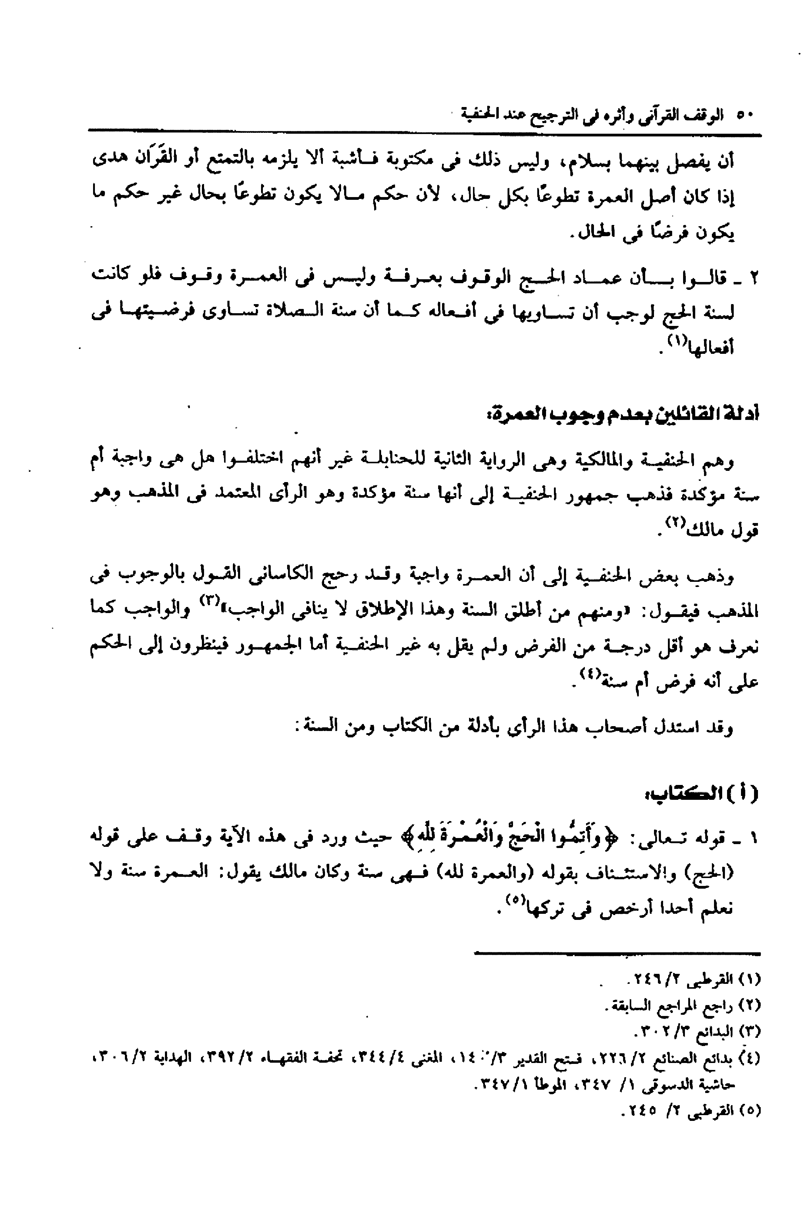 1 - قوله تعالى: وَأَتِمُّوا الْحَجَّ وَالْعُمْرَةَ لِلَّهِ حيث ورد فى هذه الآية وقف على قوله (الحج) والاستئناف بقوله (والعمرة لله) فهى سنة وكان مالك يقول: العمرة سنة ولا نعلم أحدا أرخص فى تركها «5».