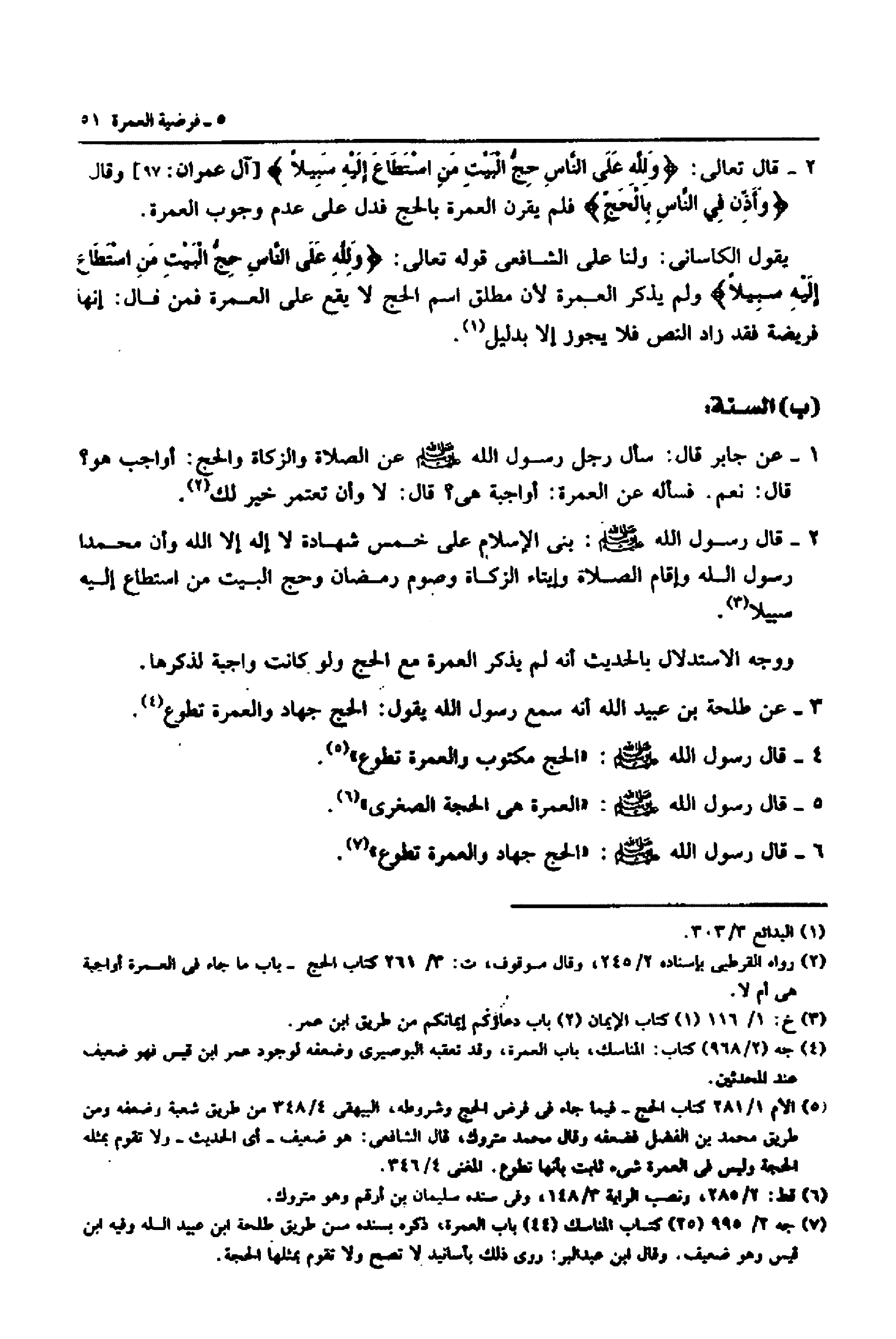 (5) الأم 1/ 281 كتاب الحج- فيما جاء فى فرض الحج وشروطه، البيهقى 4/ 348 من طريق شعبة وضعفه ومن طريق محمد بن الفضل فضعفه وقال محمد متروك، قال الشافعى: هو ضعيف- أى الحديث- ولا تقوم بمثله الحجة وليس فى العمرة شىء ثابت بأنها تطوع. المغنى 4/ 346.