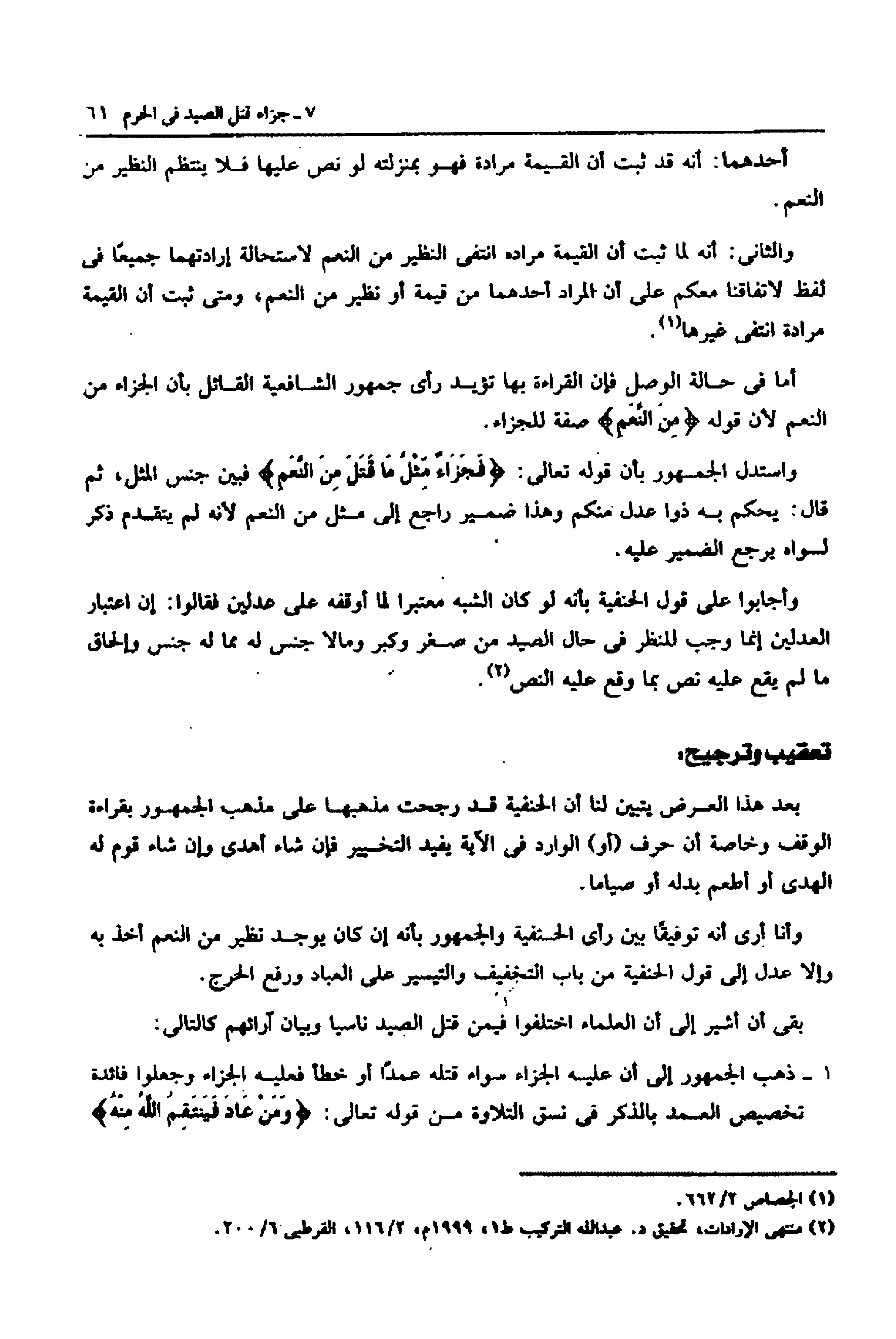 والثانى: أنه لما ثبت أن القيمة مراده انتفى النظير من النعم لاستحالة إرادتهما جميعا فى لفظ لاتفاقنا معكم على أن المراد أحدهما من قيمة أو نظير من النعم، ومتى ثبت أن القيمة مرادة انتفى غيرها «1».