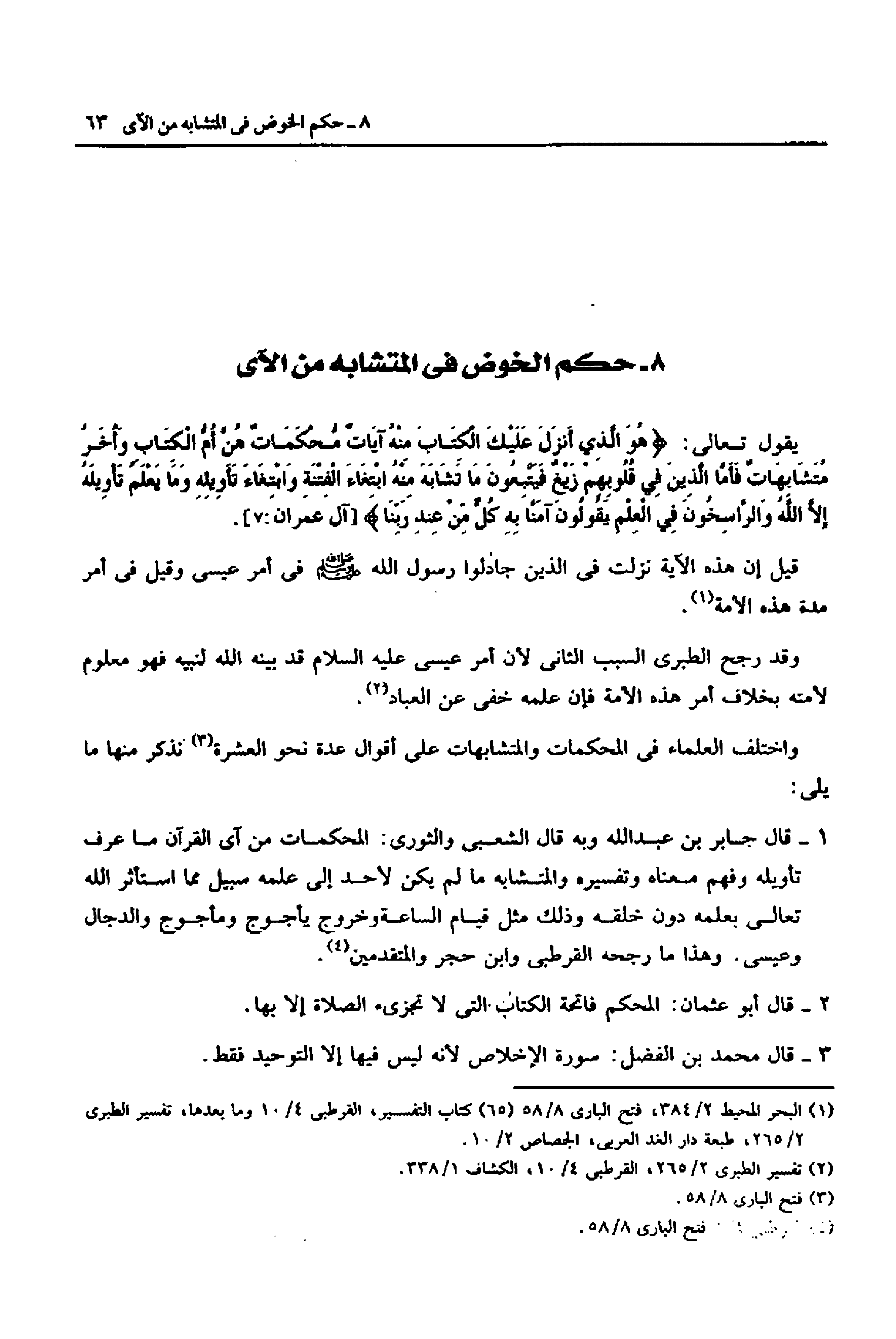 واختلف العلماء فى المحكمات والمتشابهات على أقوال عدة نحو العشرة «3» نذكر منها ما يلى: