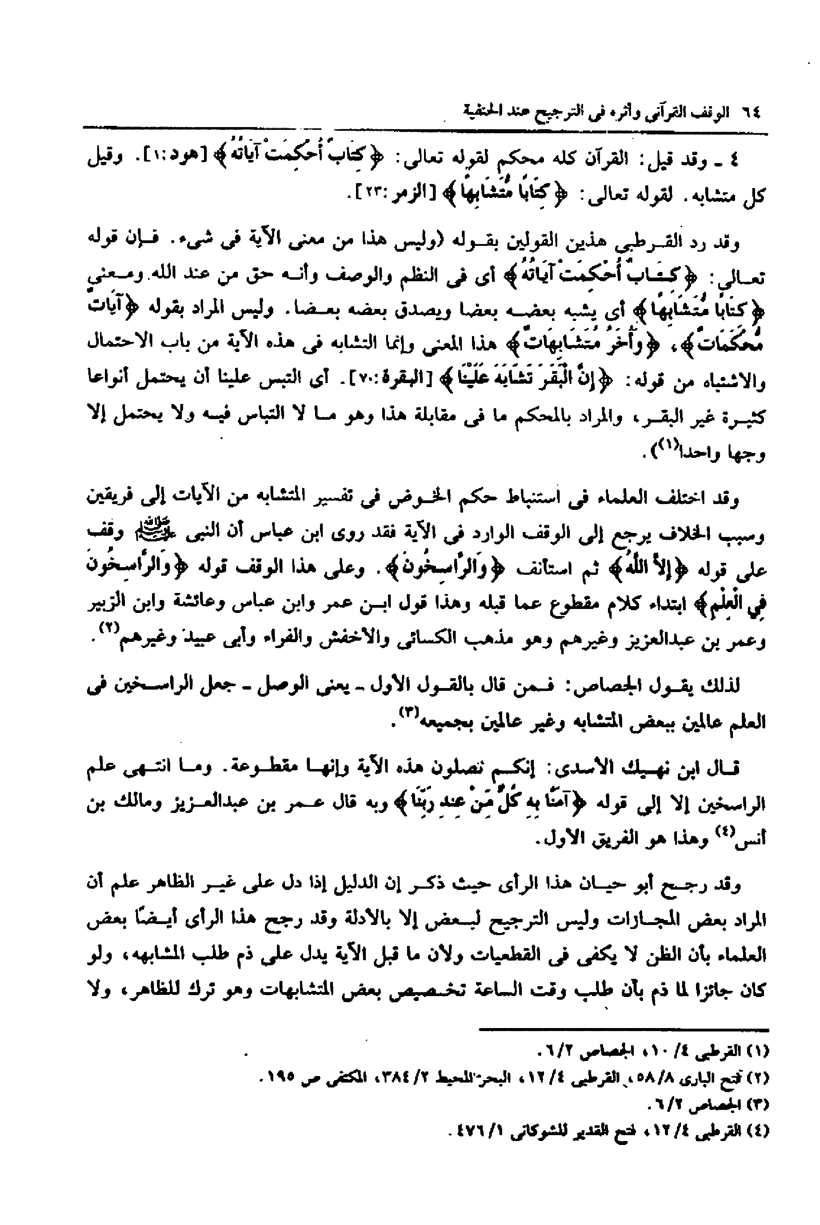 لذلك يقول الجصاص: فمن قال بالقول الأول- يعنى الوصل- جعل الراسخين فى العلم عالمين ببعض المتشابه وغير عالمين بجميعه «3».