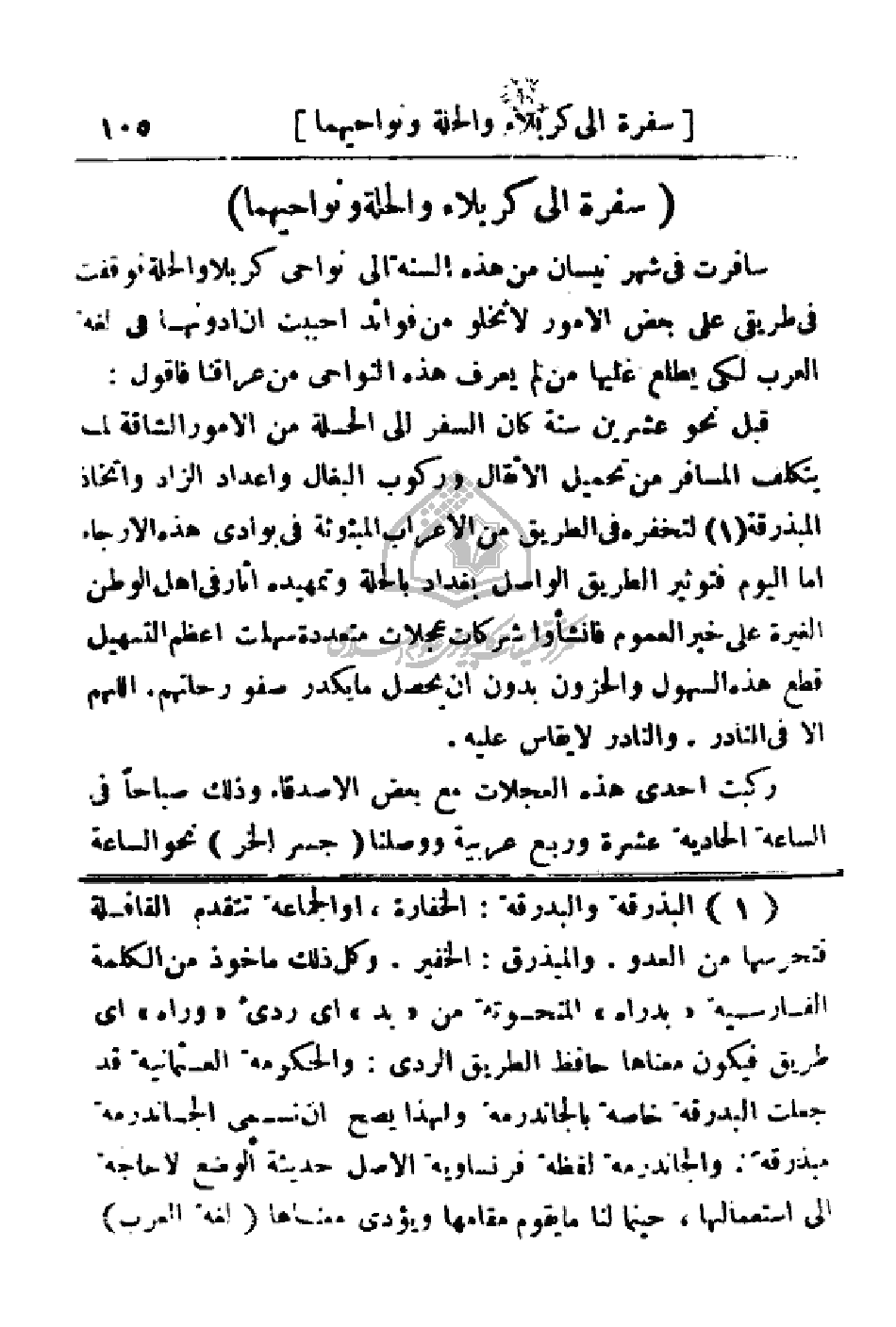 سافرت في شهر نيسان من هذه السنة إلى نواحي كربلا والحلة فوقفت في طريقي على بعض الأمور لا تخلو من فوائد أحببت أن أدونها في لغة العرب لكي يطلع عليها من لم يعرف هذه النواحي من عراقنا فأقول: