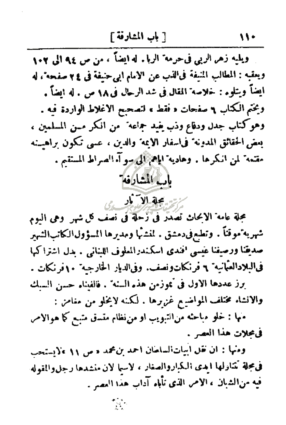مجلة عامة الأبحاث تصدر في رحلة في نصف كل شهر وهي اليوم شهرية موقتاً. وتطبع في دمشق. لمنشئها ومديرها المسؤول الكاتب الشهير صديقنا ورصيفنا عيسى أفندي أسكندر المعلوف اللبناني. بدل اشتراكها في البلاد العثمانية 6 فرنكات ونصف. وفي الديار الخارجية 10 فرنكات.