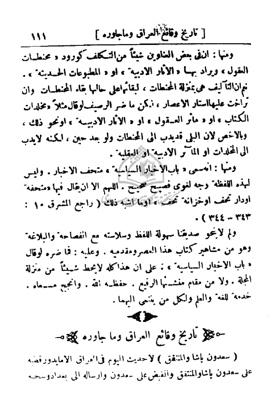 ومنها: أن في بعض العناوين شيئاً من التكلف كورود (مخطات العقول) ويراد بها (الآثار الأدبية) أو (المطبوعات الحديثة). نعم أن التأليف هي بمنزلة المحنطات، لبقائها على حالها بقاء المحنطات وان تراخت عليها أستار الاعصار، لكن ما ضر الرصيف لو قال مثلاً (مخلدات الكتاب) أو (مآثر العقول) أو (الآثار الأدبية) أو نحو ذلك، وبالأخص لان البلى قد يدب إلى المحنطات ولو بعد حين، لكنه لا يدب إلى المخلدات أو المآثر الأدبية أو العقلية.
