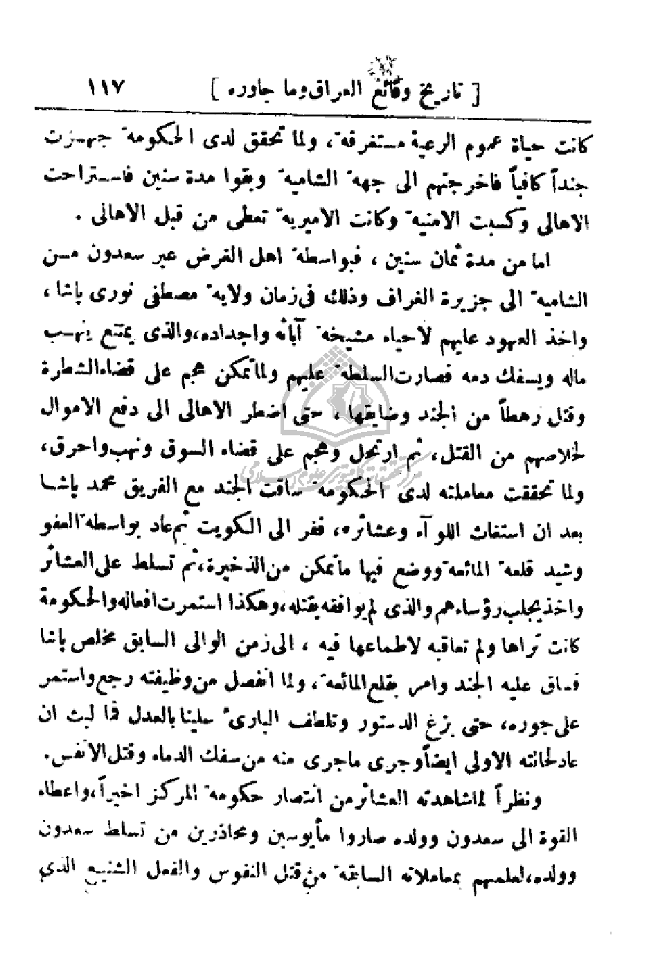 أما من مدة ثمان سنين، فبواسطة أهل الغرض عبر سعدون من الشامية إلى جزيرة الغراف وذلك في زمان ولاية مصطفى نوري باشا، واخذ العهود عليهم لإحياء مشيخة آبائه وأجداده، والذي يمتنع ينهب ماله ويسفك دمه فصارت السلطة عليهم ولما تمكن هجم على قضاء الشطرة وقتل رهطاً من الجند وضايقها، حتى اضطر الأهالي إلى دفع الأموال لخلاصهم من القتل، ثم ارتحل وهجم على قضاء السوق ونهب واحرق، ولما تحققت معاملته لدى الحكومة ساقت الجند مع الفريق محمد باشا بعد أن استغاث اللواء وعشائره، ففر إلى الكويت ثم عاد بواسطة العفو وشيد قلعة المائعة ووضع فيها ما تمكن من الذخيرة، ثم تسلط على العشائر واخذ يجلب رؤساءهم والذي لم يوافقه يقتله، وهكذا استمرت أفعاله والحكومة كانت تراها ولم تعاقبه لإطماعها فيه، إلى زمن الوالي السابق مخلص باشا فساق عليه الجند وأمر بقلع المائعة، ولما انفصل من وظيفته رجع واستمر على جوره، حتى بزغ الدستور وتلطف الباري علينا بالعدل فما لبث أن عاد لحانته الأولى أيضاً وجرى ما جرى منه من سفك الدماء وقتل الأنفس. ونظراً لما شاهدته العشائر من انتصار حكومة المركز أخيراً، وإعطاء القوة إلى سعدون وولده صاروا مأيوسين ومحاذرين من تسلط سعدون وولده، لعلمهم بمعاملاته السابقة من قتل النفوس والفعل الشنيع الذي