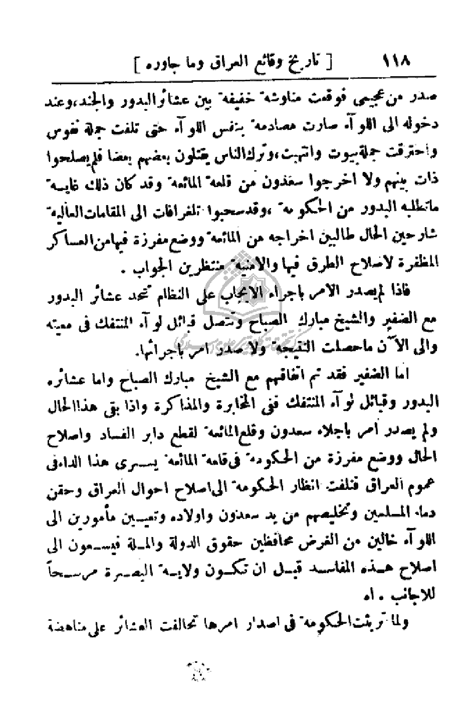 أما الضفير فقد ثم اتفاقهم مع الشيخ مبارك الصباح وأما عشائره البدور وقبائل لواء المنتفك ففي المخابرة والمذاكرة وإذا بقى هذا الحال ولم يصدر أمر بإجلاء سعدون وقلع المائعة لقطع دابر الفساد وإصلاح الحال ووضع مفرزة من الحكومة إلى إصلاح أحوال العراق وحقن دماء المسلمين وتخليصهم من يد سعدون وأولاده وتعيين مأمورين إلى اللواء خالين من الغرض محافظين حقوق الدولة والملة فيسعون إلى إصلاح هذه المفاسد قبل أن تكون ولاية البصرة مسرحاً للأجانب. اهـ