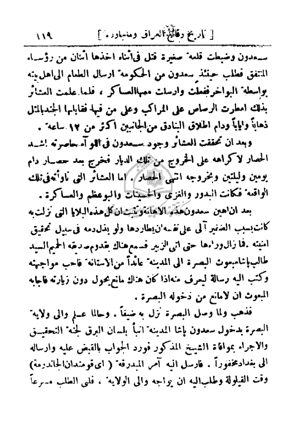 سعدون باشا المدينة أنبأ بلسان البرق لجنة التحقيق والأجراء بموافاة الشيخ المذكور فورد الجواب بالقبض عليه وإرساله إلى بغداد مخفوراً. فأرسل إليه آمر المبدرقة (أي قومندان الجاندرمة) وقت القيلولة وطلب إليه أن يواجه والي الولاية، فلبى الطلب مسرعاً