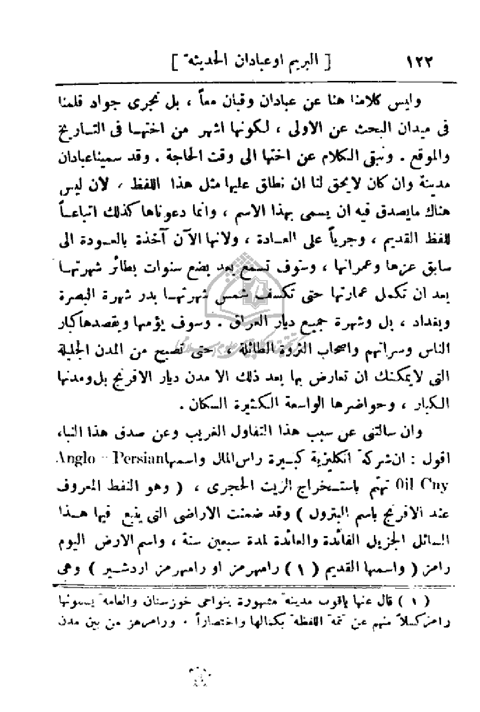 وليس كلامنا هذا هو جواد قلمنا في ميدان البحث عن الأولى، لمونها أشهر من أختها في التاريخ والموقع. ونبقى الكلام عن اختنا إلى وقت الحاجة. وقد سمينا عبادان مدينة وان كان لا يحق لنا نطلق عليها مثل هذا اللفظ، لان ليس هناك ما يصدق فيه أن يسمي بهذا الاسم، وإنما دعوناها كذلك اتباعاً للفظ القديم، وجرياً على العادة، ولأنها الآن آخذة بالعودة إلى سابق عزها وعمرانها، وسوف تسمع بعد بضع ساعات بطائر شهرتها بعد أن تكمل عمارتها حتى تكسف شمس شهرتها بدر شهرة البصرة وبغداد، بل وشهرة جميع ديار العراق. وسوف يؤمها ويقصدها كبار الناس وسراتهم وأصحاب الثروة الطائلة، حتى تصبح من المدن الجليلة التي لا يمكنك أن تعارض بها بعد ذلك إلا من مدن ديار الإفرنج بل ومدنها الكبار، وحواضرها الواسعة الكثيرة السكان.