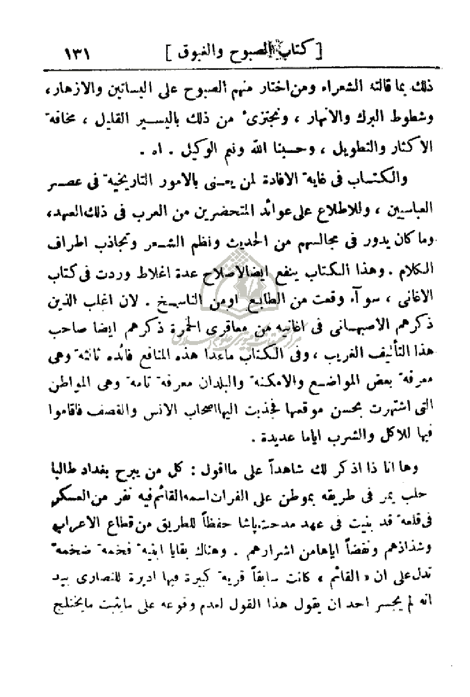 وها أنا اذكر لك شاهدا على ما أقول: كل من يبرح بغداد طالبا حلب يمر في طريقه بموطن على الفرات اسمه القائم فيه نفر من العسكر في قلعة قد بنيت في عهد مدحت باشا حفظاً للطريق من قطاع الإعراب وشذاذهم ونفضاً إياها من أشرارهم. وهناك بقايا أبنية فخمة ضخمة تدل على أن (القائم) كانت سابقاً قرية كبيرة فيها أديرة للنصارى بيد انه لم يجسر أحد أن يقول هذا القول لعدم وقوعه على ما يثبت ما يختلج