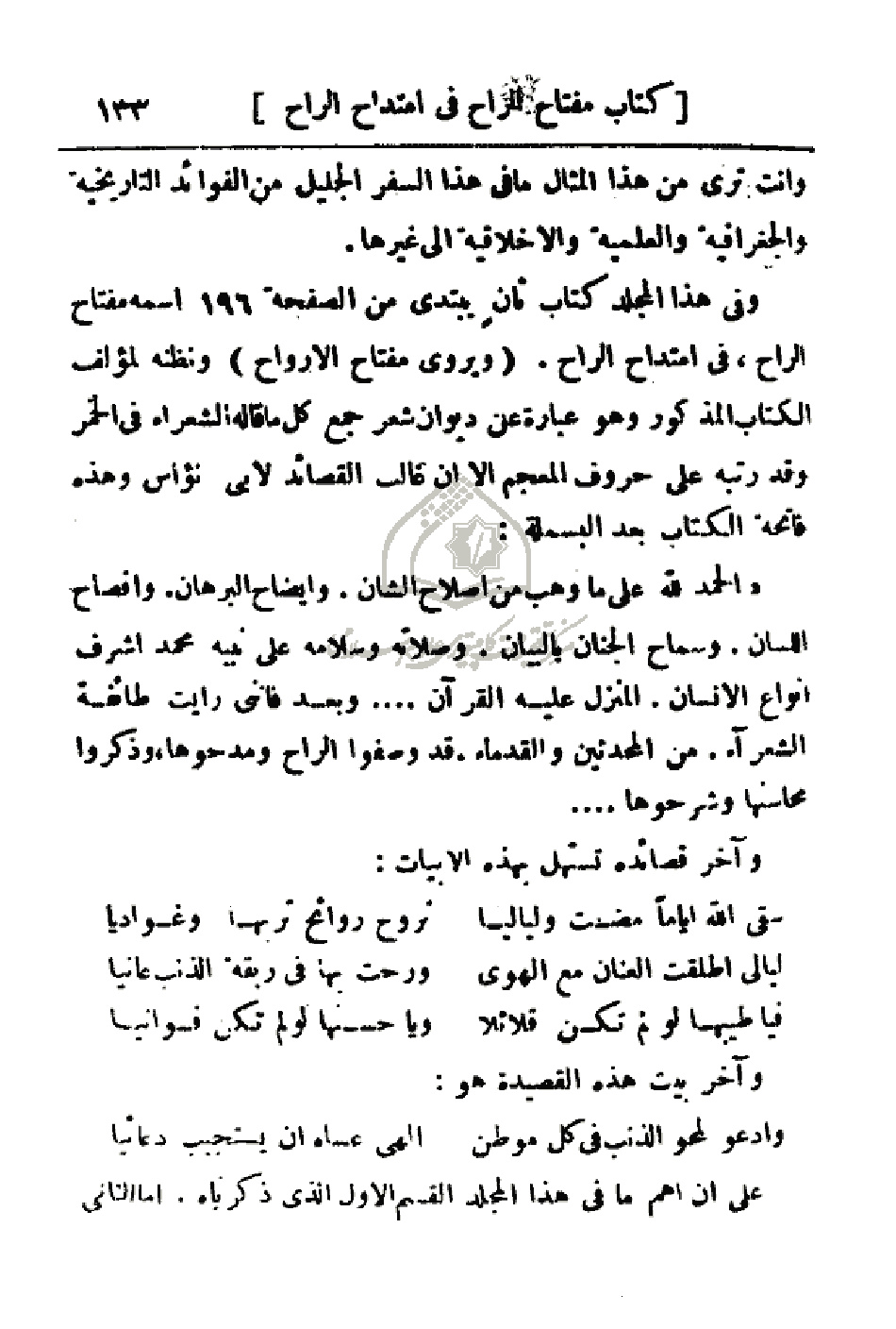 وفي هذا المجلد كتاب ثانٍ يبتدي من الصفحة 196 اسمه مفتاح الراح، في امتداح الراح. (ويروى مفتاح الأرواح) ونظنه لمؤلف الكتاب المذكور وهو عبارة عن ديوان شعر جمع كل مقاله الشعراء في الخمر وقد رتبه على حروف المعجم إلا أن غالب القصائد لأبي نؤاس وهذه فاتحة الكتاب بعد البسملة: