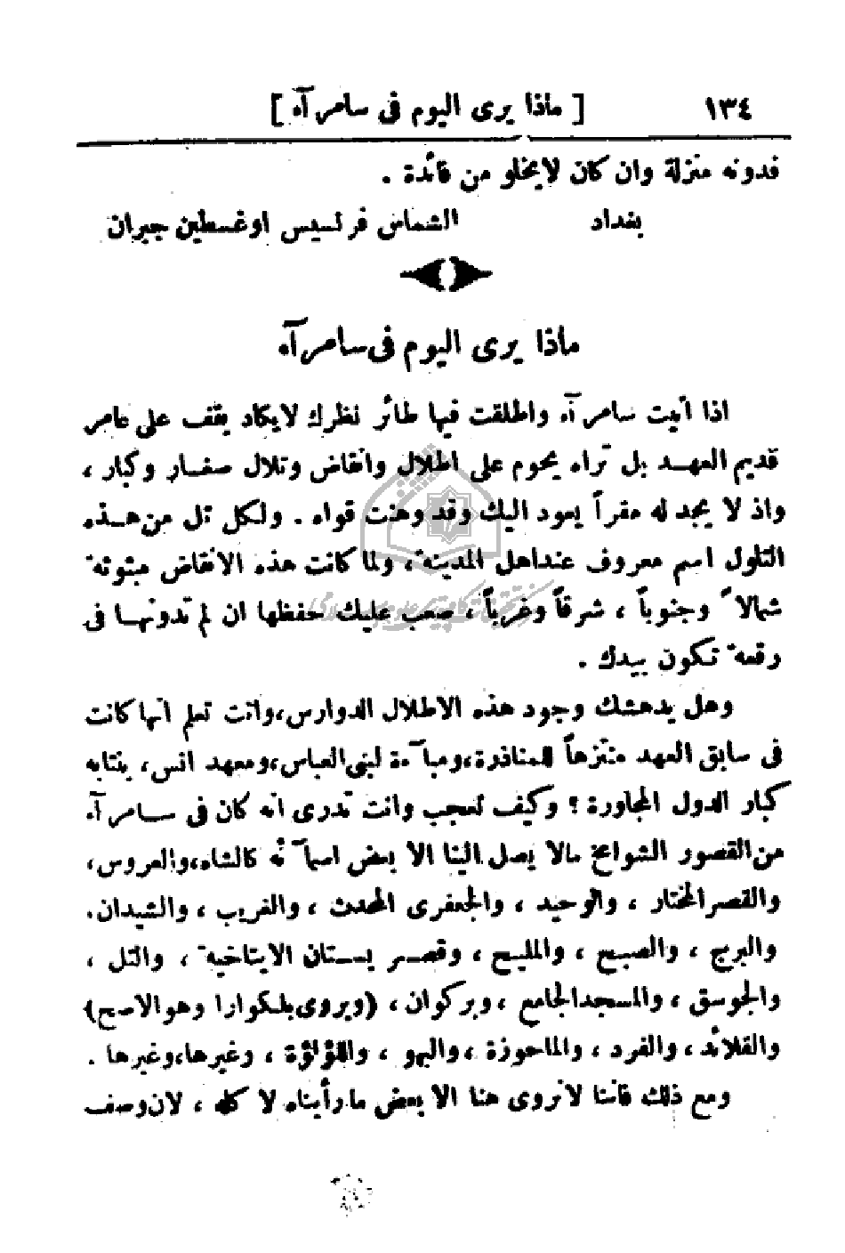إذا أتيت سامراء وأطلقت فيها طائر نظرك لا يكاد يقف على عامر قديم العهد بل تراه يحوم على أطلال وأنقاض وتلال صغار وكبار، وإذ لا يجد له مقراً يعود إليك وقد وهنت قواه. ولكل تل من هذه التلول اسم معروف عند أهل المدينة، ولما كانت هذه الأنقاض مثبوثة شمالاً وجنوباً، شرقاً وغرباً، صعب عليك حفظها أن لم تدونها في رقعة تكون بيدك.