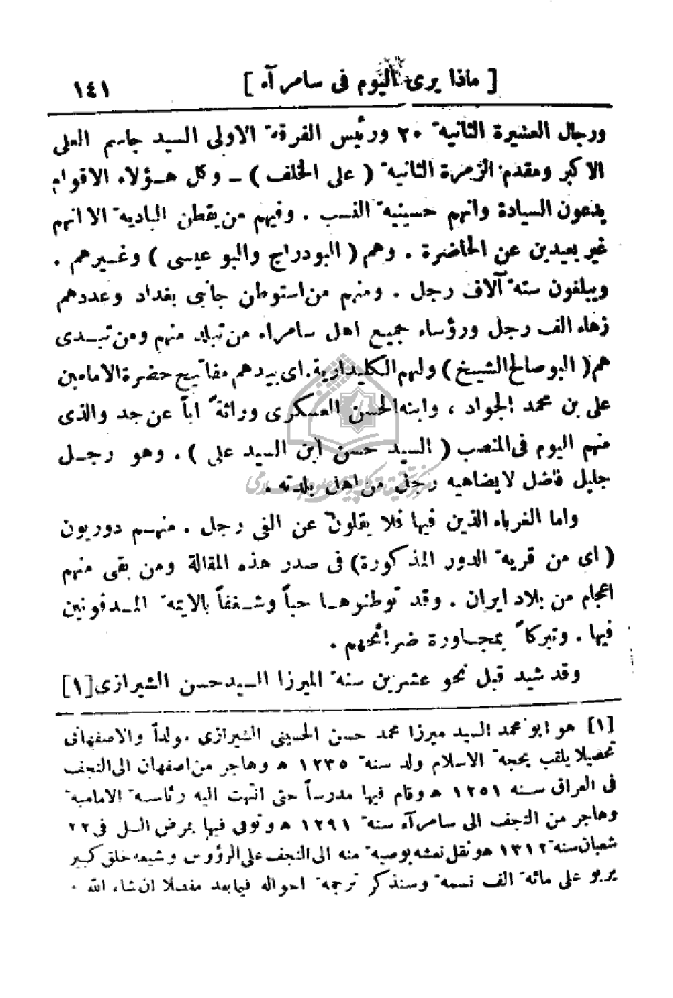 ورجال العشيرة الثانية 20 ورئيس الفرقة الأولى السيد جاسم العلي الأكبر ومقدم الزمرة الثانية (علي خلف) - وكل هؤلاء الأقوام يدعون السيادة وانهم حسينية النسب. وفيهم من يقطن البادية إلا انهم غير بعيدين عن الحاضرة. وهم (البو دراج) والبو عيسى) وغيرهم. ويبلغون ستة آلاف رجل. ومنهم من استوطن جانبي بغداد وعددهم زهاء ألف رجل ورؤساء جميع أهل سامراء من بلد منهم ومن تبدي هم (البو صالح الشيخ) ولهم الكليدارية أي بيدهم مفاتيح حضرة الإمامين علي بن محمد الجواد، وأبو الحسن العسكري وراثةً أباً عن جد والذي منهم اليوم في المنصب