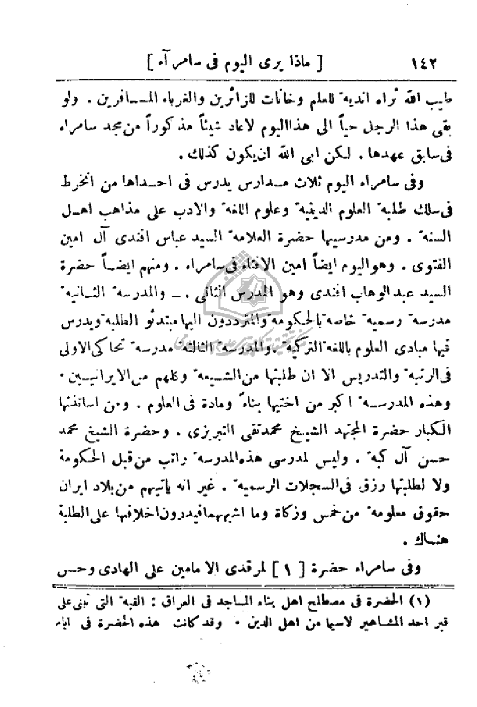 وفي سامراء اليوم ثلاث مدارس يدرس في إحداها من انخرط في سلك طلبة العلوم الدينية وعلوم اللغة والأدب على ذاهب أهل السنة. ومن مدرسيها حضرة العلامة السيد عباس أفندي آل أمين الفتوي. وهو اليوم أيضاً أمين الإفتاء في سامراء. ومنهم أيضاً حضرة السيد عبد الوهاب أفندي وهو المدرس الثاني. - والمدرسة الثانية مدرسة رسمية خاصة بالحكومة والمترددون إليها مبتدئو الطلبة ويدرس فيها مبادئ العلوم التركية. والمدرسة الثالثة مدرسة تحاكي الأولى في الرتبة والتدريس إلا أن طلبتها من الشيعة وكلهم من الإيرانيين. وهذه المدرسة أكبر بناءً من أختها بناءً ومادة في العلوم. ومن أساتذتها الكبار حضرة المجتهد الشيخ محمد تقي التبريزي. وحضرة الشيخ محمد حسن آل كبة. وليس لمدرسي هذه المدرسة راتب من قبل الحكومة ولا لطلبتها رزق في السجلات الرسمية. غير انه يأتيهم من بلاد إيران حقوق معلومة من خمس وزكاة وما أشبههما فيدرون إخلافها على الطلبة هناك.