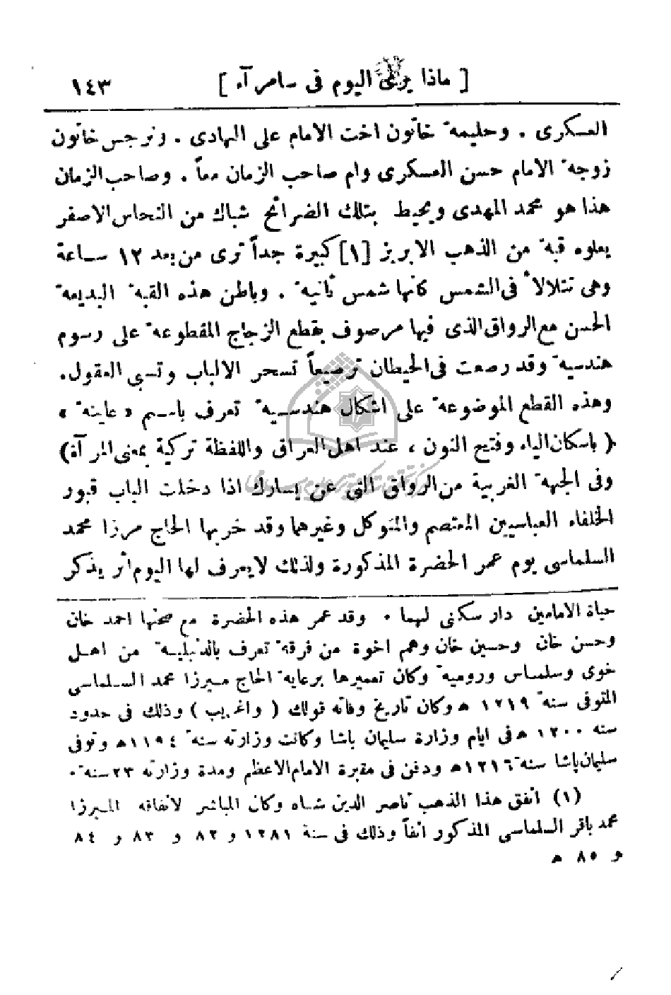 العسكري. وحليمة خاتون أخت الإمام علي الهادي. ونرجس خاتون زوجة الإمام حسن العسكري وأم صاحب الزمان معاً. وصاحب الزمان هذا هو محمد المهدي ويحيط بتلك الضرائح شباك من النحاس الأصفر يعلوه قبة من الذهب الإبريز كبيرة جداً ترى من بعد 12 ساعة وهي تتلألأ في الشمس كأنها شمس ثانية. وباطن هذه القبة البديعة الحسن مع الرواق الذي فيها مرصوف بقطع الزجاج المقطوعة على رسوم هندسية وقد رصعت في الحيطان ترصيعاً تسحر الألباب وتسبي العقول. وهذه القطع الموضوعة على أشكال هندسية تعرف باسم (عاينة) (بإسكان