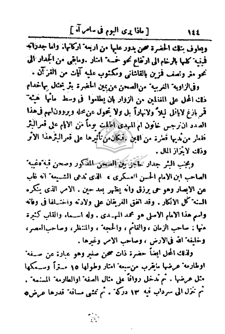 وفي الزاوية الغربية من الصحن عن يمين الحضرة بئر يحتال بها خدام ذلك المحل على المغفلين من الزوار بأن يطلعوا في وسط مائها هيئة قمر بازغ لا يأفل ليلاً ولا نهاراً بل ولا يتحول عن محله ويروون لهم في هذا الصدد أن نرجس خاتون أم المهدي أطلت يوماً من الأيام على قمر البئر فقطر من ثديها قطرة من اللبن. فكان من تأثيرها على قعر البئر هذا الأثر وذلك لابتزاز المال.