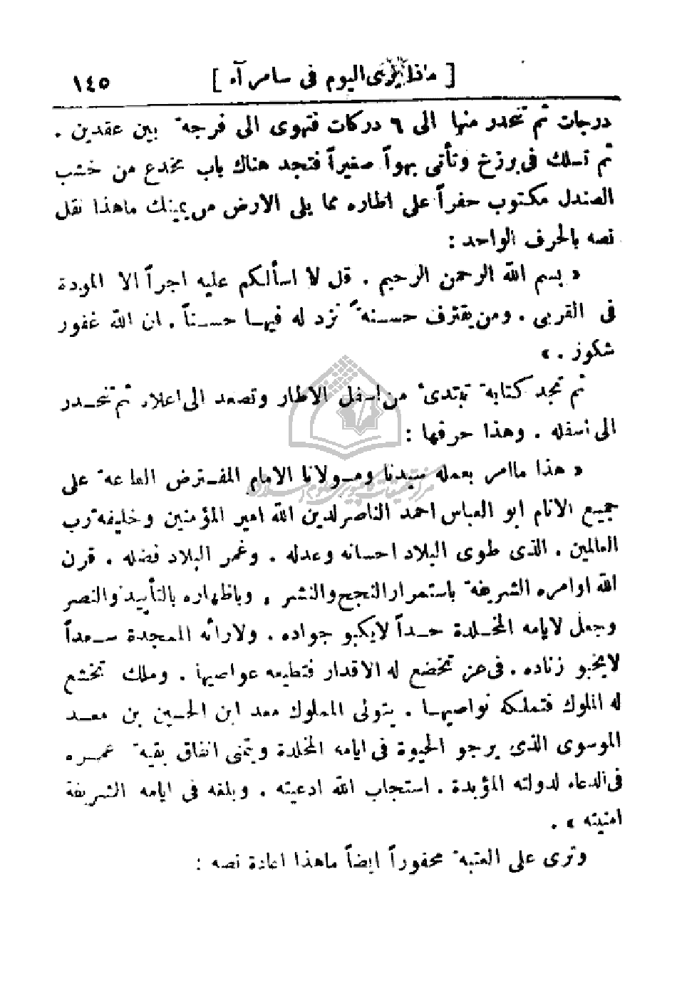 (هذا ما أمر بعمله سيدنا ومولانا الإمام المفترض الطاعة على جميع الأنام أبو العباس احمد الناصر لدين الله أمير المؤمنين وخليفة رب العالمين. الذي طوى البلاد إحسانه وعدله. وغمر البلاد فضله. قرن الله أوامره الشريفة باستمرار النجح والنشر. وبإظهاره التأييد والنصر وجعل لأيامه المخلدة حداً لا يكبو جواده. ولآرائه الممجدة سعداً لا يخبو زناده في عز تخضع له الأقدار فتطيعه عواصيها. وملك تخشع له الملوك فتملكه نواصيها. يتولى المملوك معد ابن الحسين بن معد الموسوي الذي يرجو الحيوة في أيامه المخلدة ويتمنى أنفاق بقية عمره في الدعاء لدولته المؤبدة. استجاب الله ادعيته. وبلغه في أيامه الشريفة أمنيته).