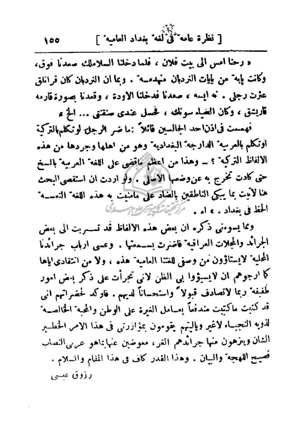 فهمست في إذن أحد الجالسين قائلاً: ما ضر الرجل لو تكلم التركية أو تكلم العربية الدارجة البغدادية وهو من أهلها من هذه الألفاظ التركية؟ - وهذا من اعظم ما قضى على اللغة العربية بالمسخ حتى كادت تخرج به عن وضعها الأصلي. ولو أردت أن استقصي البحث هنا لأتيت بما يبكي الناطقين بالضاد على ما منيت به هذه اللغة التعسة الحظ في بغداد.) اهـ.
