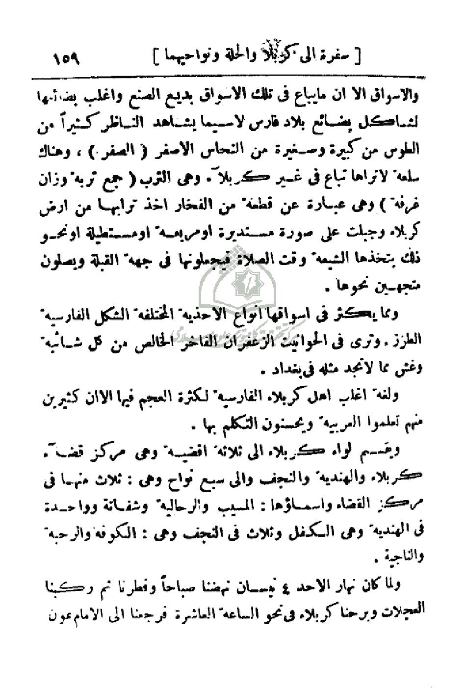 والأسواق إلا أن ما يباع في تلك الأسواق بديع الصنع واغلب بضائعها تشاكل بضائع بلاد فارس لا سيما يشاهد الناظر كثيراً من الطوس من كبيرة وصغيرة من النحاس الأصفر (الصفر)، وهناك سلعة لا تراها تباع في غير كربلاء وهي الترب (جمع تربة وزان غرفة) وهي عبارة عن قطعة من الفخار اخذ ترابها من أرض كربلاء وجبلت على صورة مستديرة أو مربعة أو مستطيلة أو نحو ذلك يتخذها الشيعة وقت الصلاة فيجعلونها في جهة القبلة ويصلون متجهين نحوها.