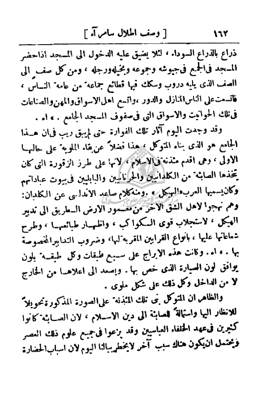 وقد وجدت اليوم آثار تلك الفوارة حتى لم يبق ريب في أن هذا الجامع هو الذي بناه المتوكل، هذا فضلاً عن بقاء الملوية على حالها الأولى، وهي اقدم مئذنة في الإسلام، لأنها على طرز الزقورة التي كان يتخذها الصابئة من الكلدانيين والحرنانيبن والبابليين في بيوت عباداتهم وكان يسنيها العرب (الهيكل). ومنه كلام صاعد الأندلسي عن الكلدان: وهم نجوا لأهل الشق الآخر من معمور الأرض الطريق إلى تدبير الهيكل، لاستجواب قوى الكواكب، وإظهار طبائعها، وطرح شعاعاتها عليها، بأنواع القرابين القربة لها، وضروب التدابير المخصوصة بها.) اهـ. وكانت هذه الأبراج على سبع طبقات وكل طبقة بلون يوافق لون السيارة الذي خص بها. ويصعد إلى أعلاها من الخارج لا من الداخل وكل ذلك على شكل ملوي.