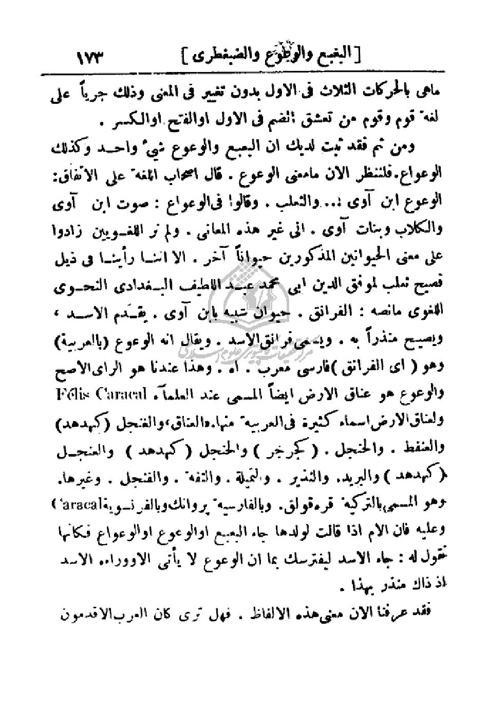 ومن ثم فقد ثبت لديك أن البعبع والوعوع شيء واحد وكذلك الوعواع. فلننظر الآن ما معنى الوعوع. قال أصحاب اللغة على الاتفاق: الوعوع ابن آوى. . . والثعلب. وقالوا في الوعواع: صوت ابن آوى والكلاب وبنات آوى. إلى غير هذه المعاني. ولم نر اللغويين زادوا على معنى الحيوانين المذكورين حيواناً آخر. إلا إننا رأينا في ذيل فصيح ثعلب لموفق الدين أبي محمد عبد اللطيف البغدادي النحوي اللغوي ما نصه: الفرانق. حيوان شبيه بابن آوى. يقدم الأسد، ويصيح منذراً به. ويسمى فرانق الأسد. ويقال إنه الوعوع (بالعربية) وهو (أي الفرانق) فارسي معرب. اهـ. وهذا عندنا هو الرأي الأصح والوعوع هو عناق الأرض أيضاً المسمى عند العلماء ولعناق الأرض أسماء كثيرة في العربية منها (العناق، والغنجل (كهدهد) والعنفط. والخنجل. (كجرجر) والحنجل (كهدهد) والعنجل (كهدهد) والبريد. والنذير. والتميلة. والتفة. والفنجل. وغيرها. وهو المسمى بالتركية قرة