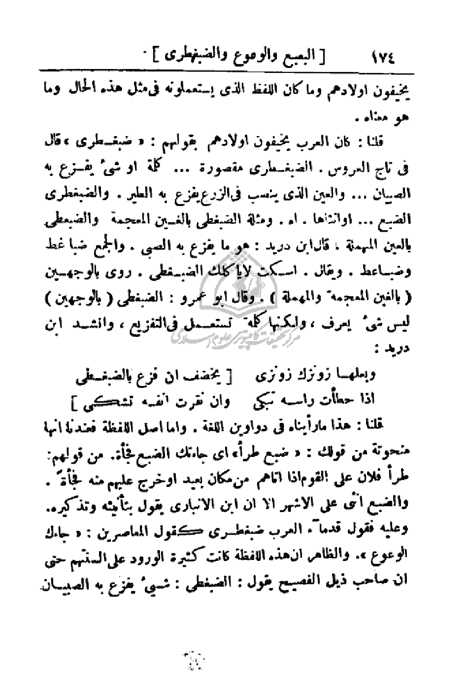 قلنا: هذا ما رأيناه في دواوين اللغة. وأما أصل اللفظة فعندنا إنها منحوتة من قولك: (ضبع طرأ) أي جاءتك الضبع فجأةً. من قولهم: طرأ فلان على القوم إذا آتاهم من مكان بعيد أو خرج عليهم منه فجأةً. والضبع أنثى على الأشهر إلا أن ابن الإنباري يقول بتأنيثه وتذكيره. وعيه فقول قدماء العرب ضبغطرى كقول المعاصرين: (جاءك الوعوع). والظاهر أن هذه اللفظة كانت كثيرة الورود على ألسنتهم حتى أن صاحب ذيل الفصيح يقول: الضبغطى: شيء يفزع به الصبيان
